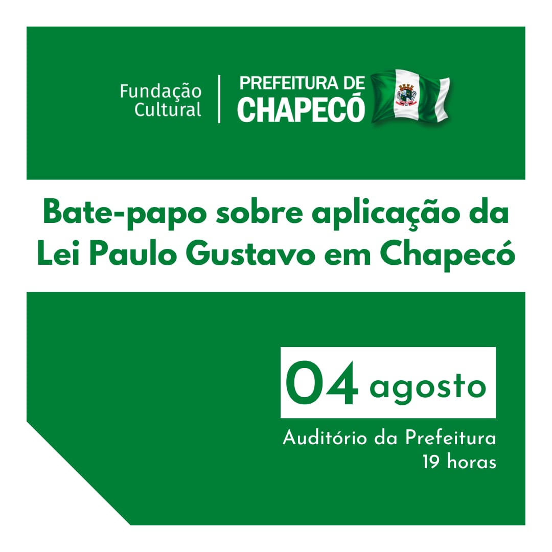 Portanto, a Fundação Cultural de Chapecó convida artistas, produtores e produtoras, empresas e espaços culturais, sociedade civil em geral, bem como demais entes interessados em participar da elaboração e implementação da Lei Paulo Gustavo em Chapecó para participar desse primeiro momento no dia 4 de agosto, às 19h, no Auditório da Prefeitura de Chapecó, que está localizado na Av. Getúlio Vargas - 957S.