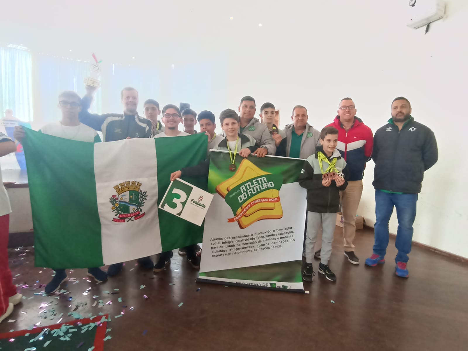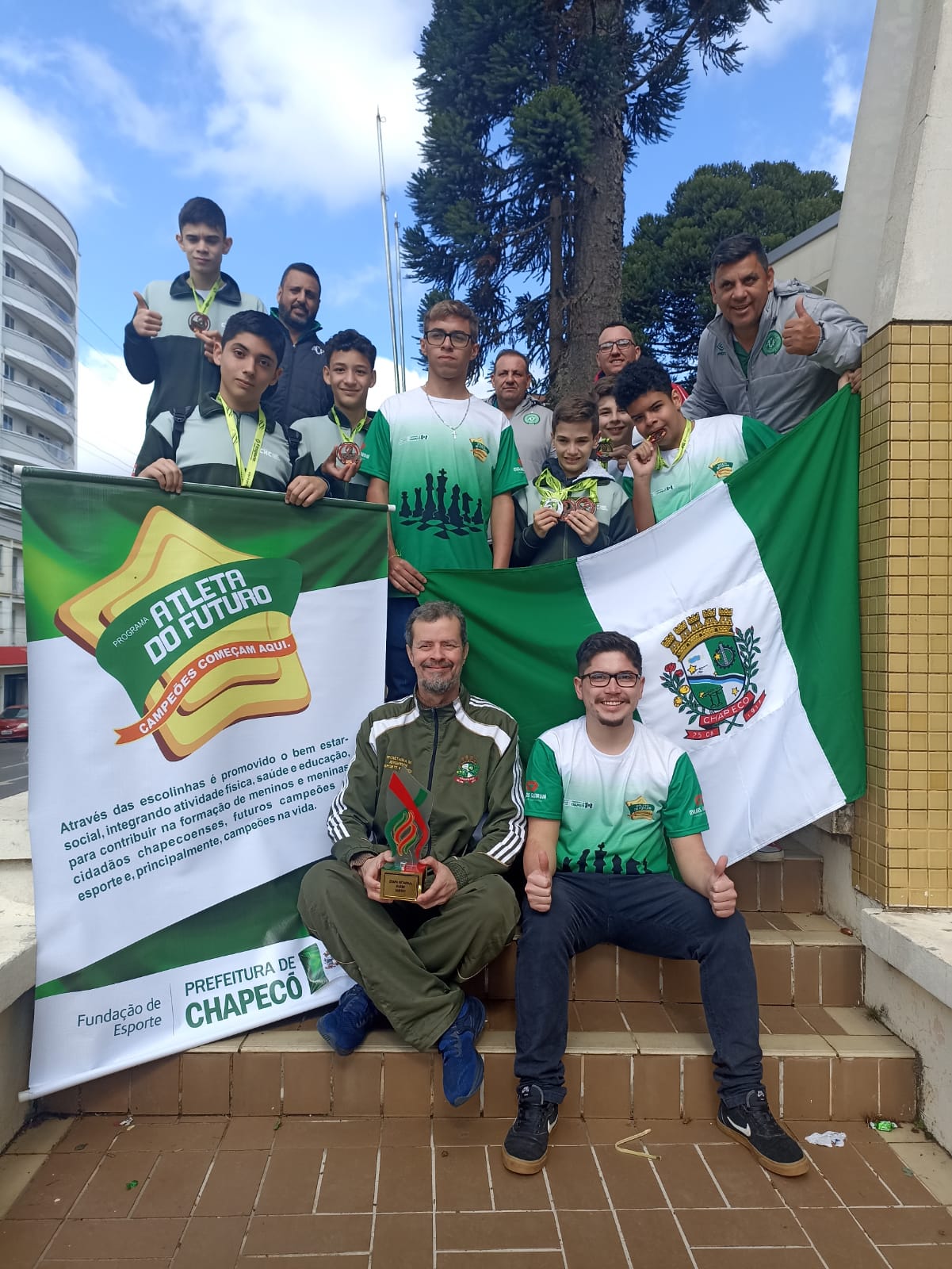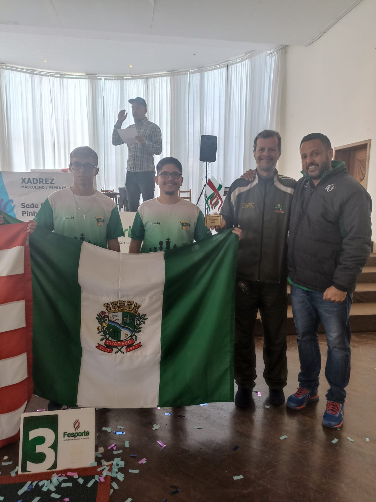 Depois de mais de 10 anos, o Xadrez Masculino de Chapecó está de volta ao pódio da Olimpíada Estudantil Catarinense (OLESC). A competição que acontece na cidade de Curitibanos, finalizou nesta sexta-feira, e Chapecó venceu sua última partida contra Joaçaba por 2,5 x 1,5, com esse resultado terminou em terceiro lugar no Xadrez por equipes e também, terceiro lugar na classificação geral da modalidade. A equipe é treinada por Marco Antônio Barbosa e todos são atletas oriundos do Programa atleta do futuro (PAF). Blumenau foi o grande campeão da Modalidade e Criciúma o vice.