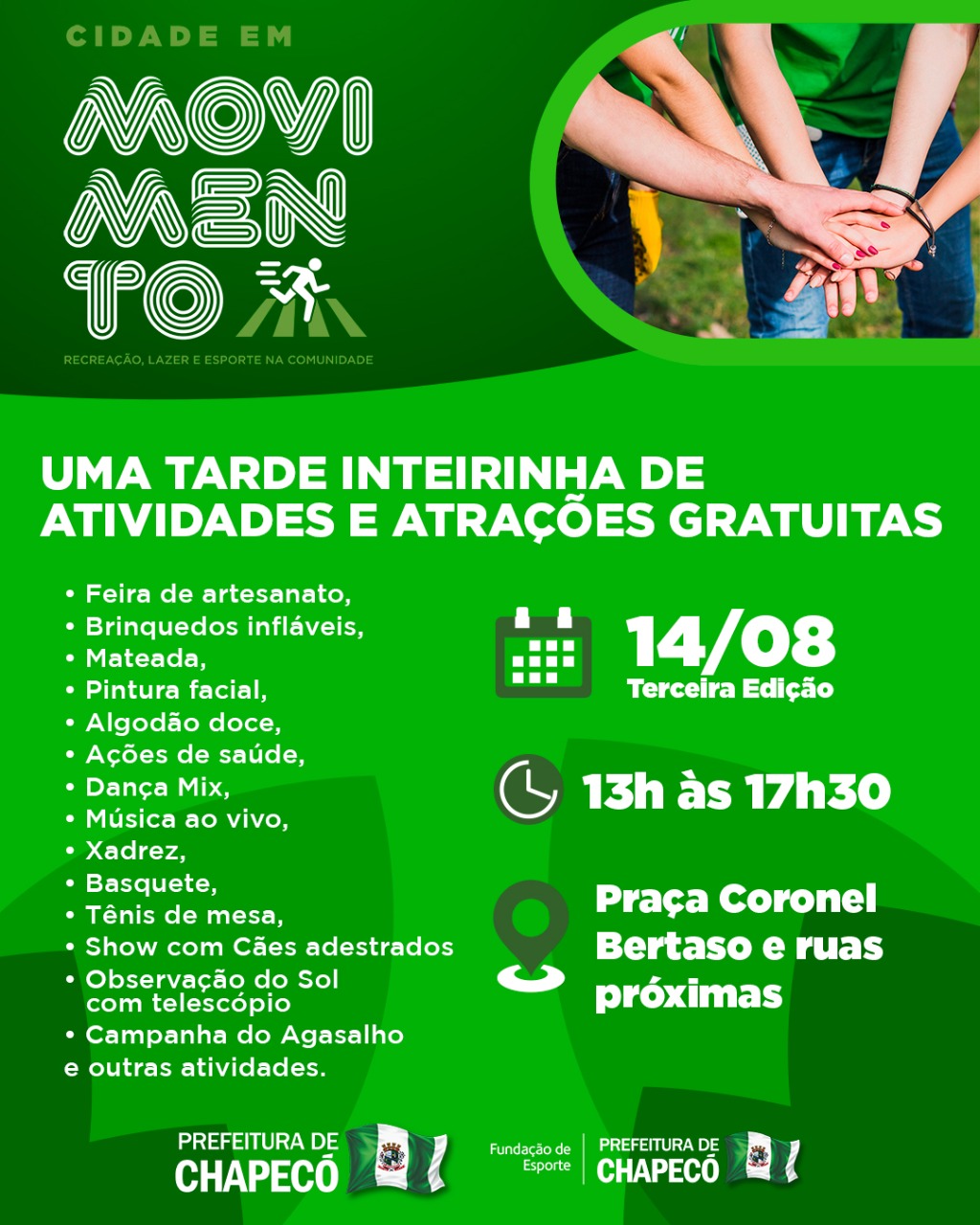 É mais uma grande promoção da Prefeitura de Chapecó e contará com brinquedos, pintura facial, atrações artísticas, mateada, show de cães, exposição de carros, livros, sorteios e brindes. É uma realização da Fundação de Esporte de Chapecó, com o apoio da Fundação Cultural de Chapecó, Diretoria de Segurança Pública, Secretaria de Saúde, Secretaria de Assistência Social, Universidades, clubes de serviços e igrejas, todos imbuídos em colaborar e fazer um grande evento disse o presidente da Fundação de Esporte de Chapecó, Agnaldo Pereira.