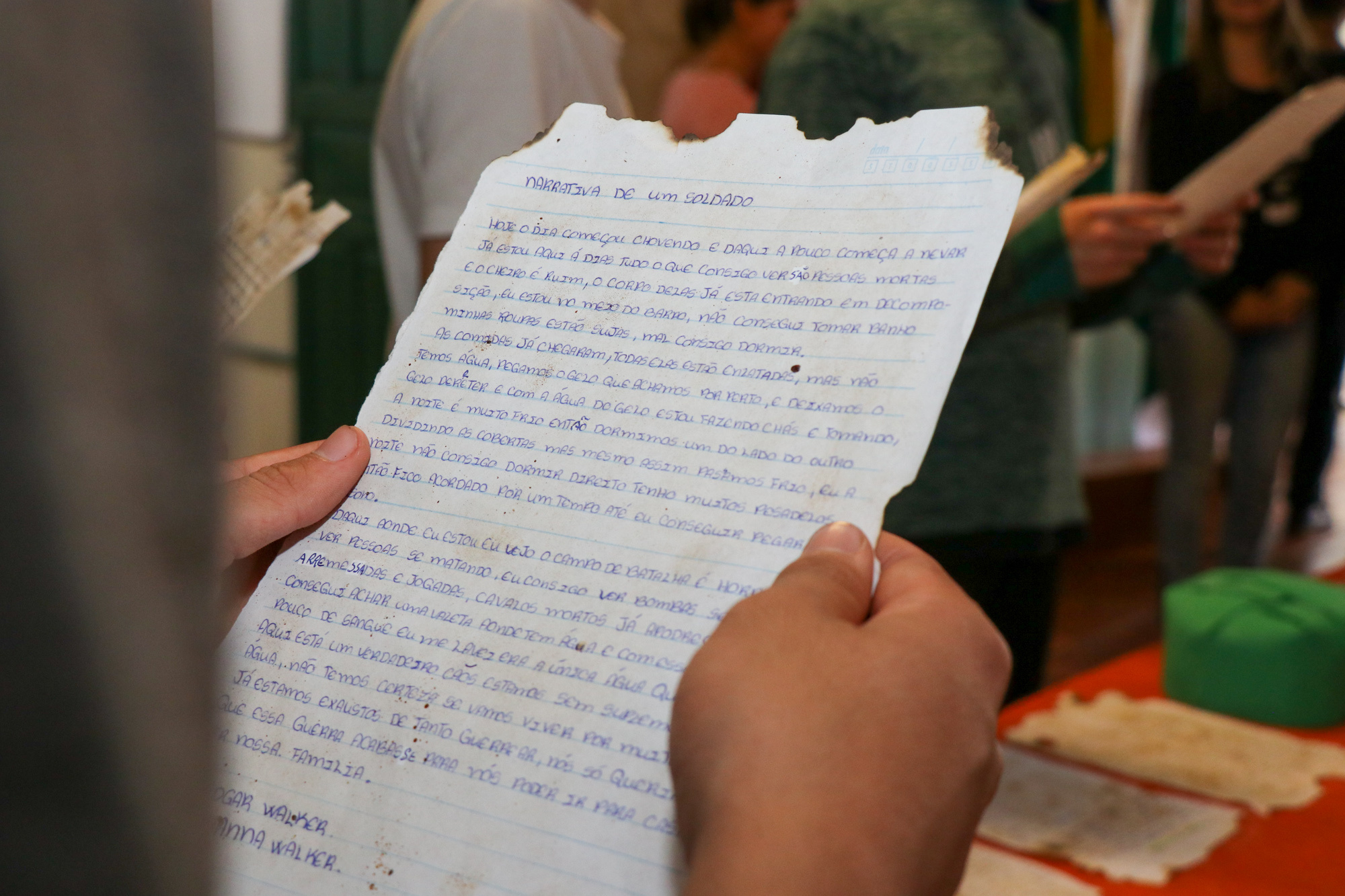 Os jovens produziram cartas que narravam situações e momentos que os militares viviam no dia a dia da guerra, contando suas perspectivas, medos e sonhos em relação ao momento em questão. No decorrer das aulas, surgiu a ideia de trabalhar com trechos de cartas de soldados para análise, reflexão e problematização. A partir disso, os educandos colocaram-se no contexto da guerra, em específico, em uma trincheira, destacou a professora.