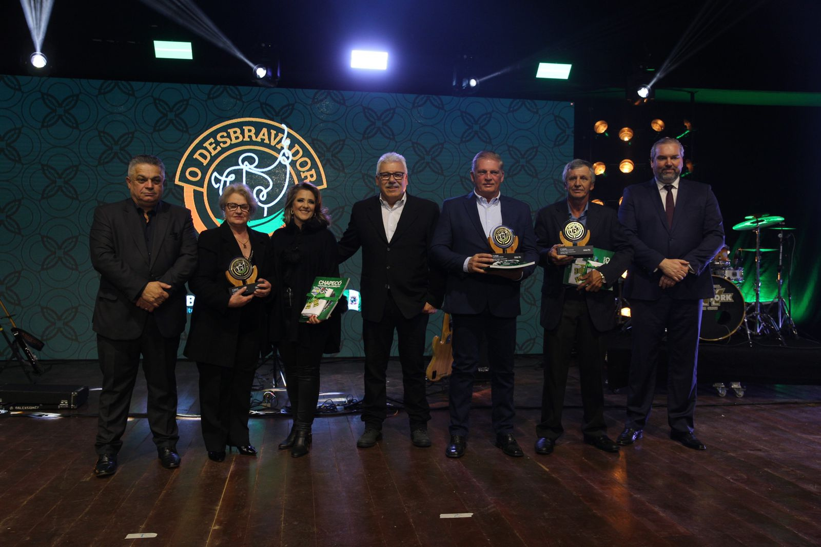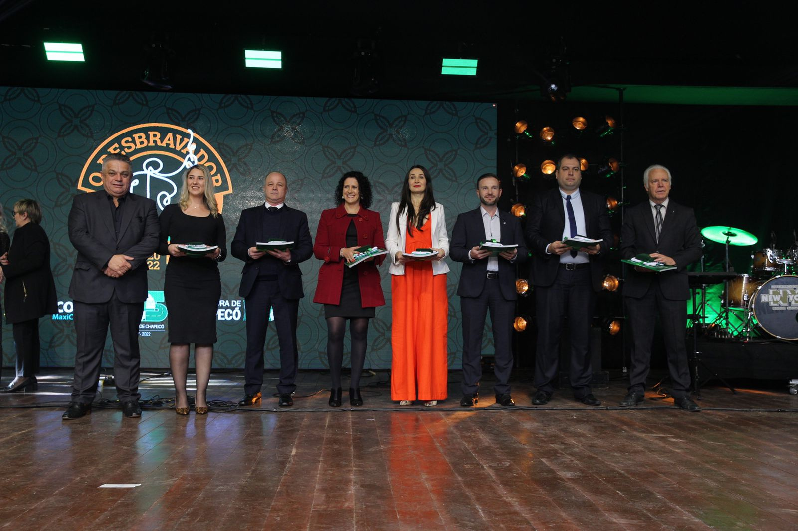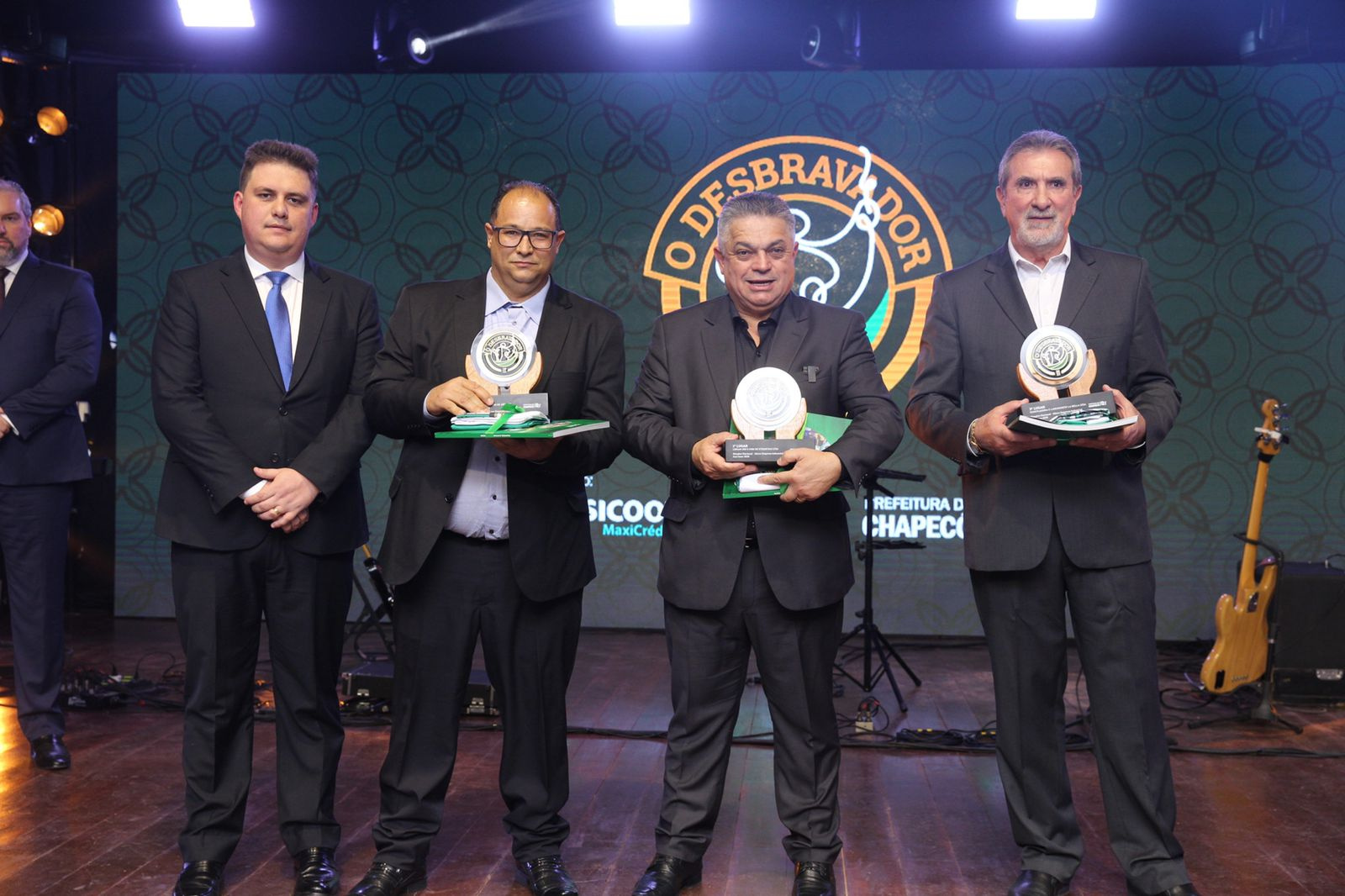 Os agraciados também receberam uma bandeira do Município, além de uma revista que mostra as obras que estão sendo realizadas em Chapecó, que já somam mais de R$ 300 milhões desde o ano passado, e devem chegar a R$ 700 milhões em obras iniciadas e concluídas até 2024. Foram mostradas em vídeo as obras projetadas e em andamento. Um dos vídeos teve a locução de Cid Moreira.