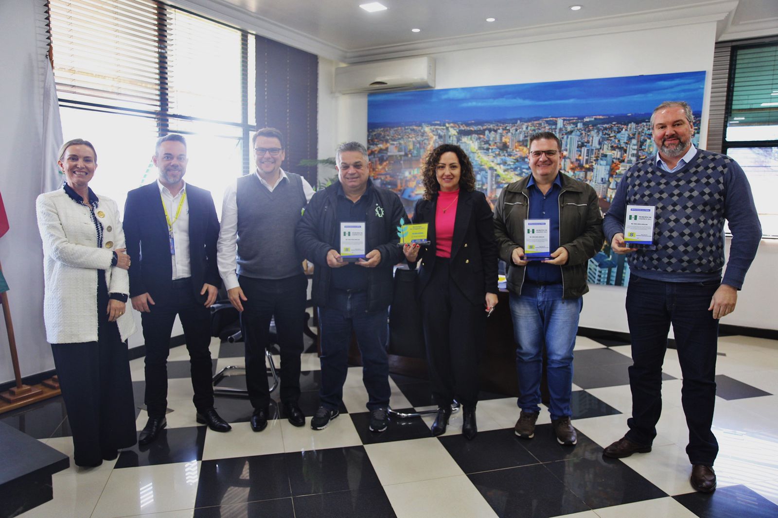 Representantes do Banco do Brasil estiveram nesta segunda-feira na Prefeitura de Chapecó, onde entregaram tombstones, que são peças em acrílico, destacando o êxito do financiamento de R$ 300 milhões junto à Administração Municipal, que foi aprovado pela Câmara de Vereadores. Eles foram recebidos pelo prefeito, João Rodrigues, pelo secretário de Governo, Thiago Felipe Etges, e pelo secretário de Fazenda, Moacir Rohr.
