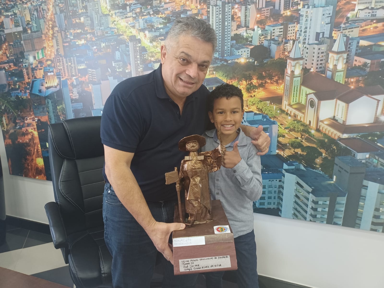 O estudante Miguel Nascimento de Andrade, do terceiro ano da Escola Básica Municipal Diogo Alves da Silva, entregou ao prefeito João Rodrigues, na manhã desta terça-feira, uma maquete do monumento O Desbravador.