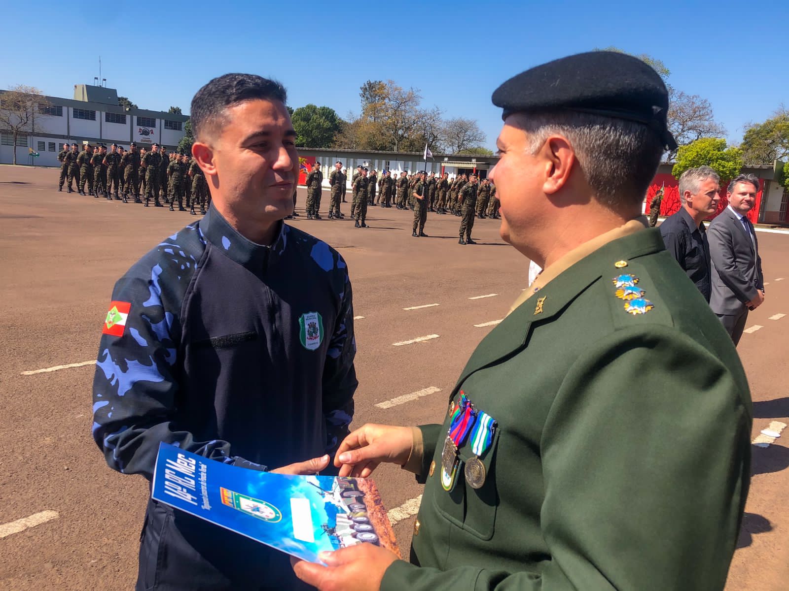 A Guarda Municipal de Chapecó foi agraciada com um diploma pelo Exército Brasileiro no último sábado, em São Miguel do Oeste. O comando do 14º Regimento de Cavalaria Mecanizado entregou ao Comandante da Guarda Municipal de Chapecó, Roger Natan de Lima, o Diploma de Amigo do Regimento. No mesmo ato também foi agraciado o consultor jurídico para Assuntos de Segurança Pública do Município de Chapecó, Márcio Bueno.