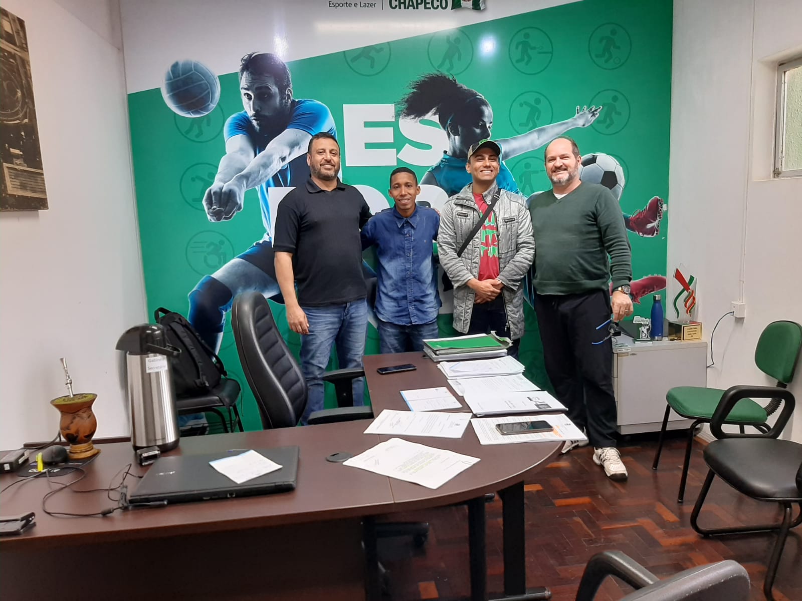 O Presidente da Fundação de Esporte de Chapecó (FEC) Agnaldo Veriato Pereira, juntamente com o professor Mestre André Luis Cecchin, coordenador de projetos e captação, receberam na semana passada venezuelanos que pretendem criar uma Associação municipal Venezuelana de Esportes..