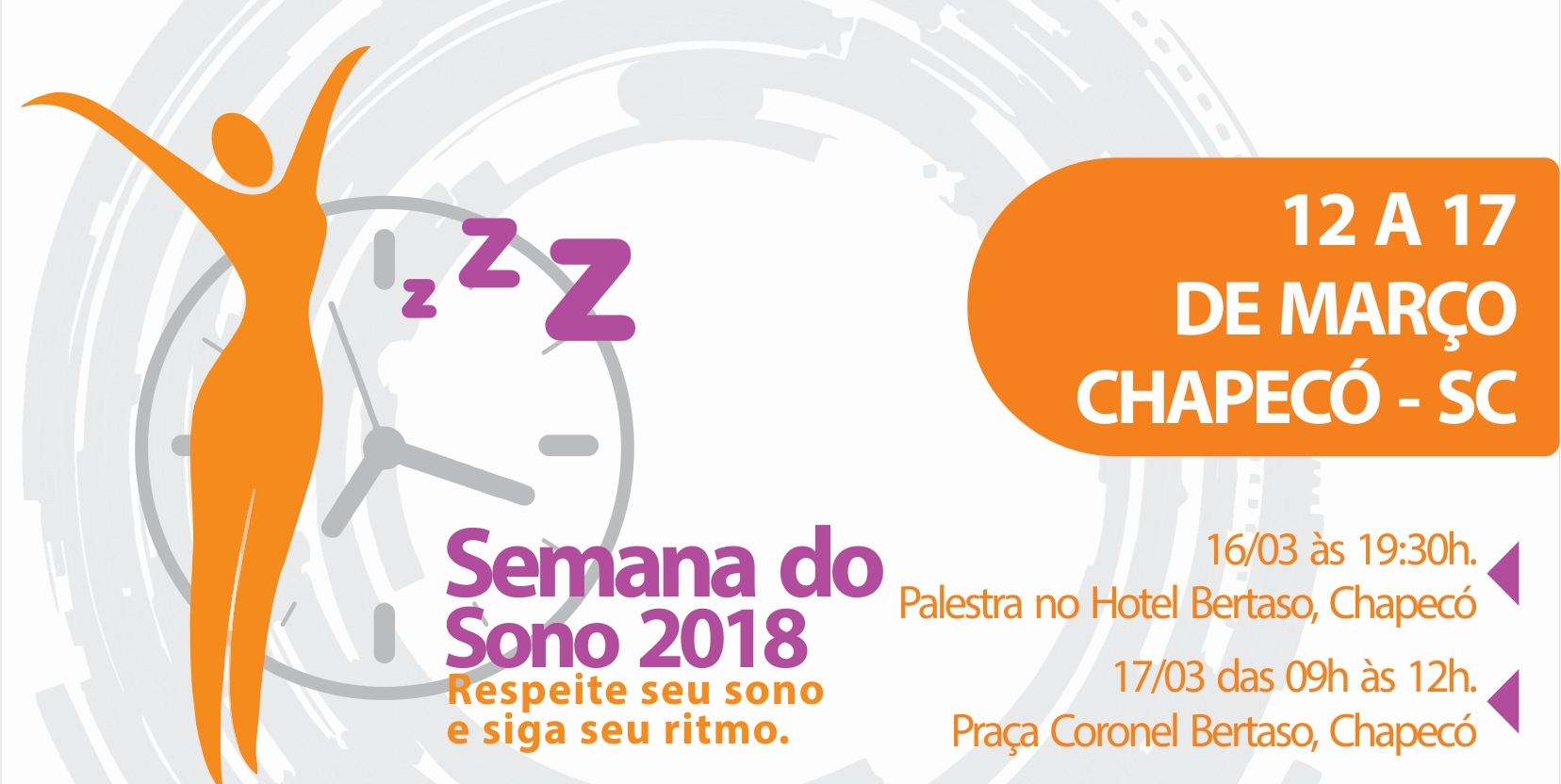 Em Chapecó está programado para sexta-feira (16), às 19h30, no Hotel Bertaso, um encontro com profissionais de saúde visando apresentar o que pode ser feito para uma melhor noite de sono e um dia mais produtivo. Na programação está previsto palestras com: Luciane Palombini Especialista em Medicina do Sono pela Academia Americana do Sono; Rosani Elizabet Bandeira Prótese e dentística; Rodrigo Armani Lino de Souza Otorrinolaringologista; Cristiano Padilha Professor Curso de Educação Física da Unochapecó; Luciara Giacobe Fonoaudióloga Mestre em Distúrbios do Sono. No sábado (17), na Praça Coronel Ernesto Bertaso, das 09 às 12 horas, profissionais estarão conversando e tirando dúvidas da população.