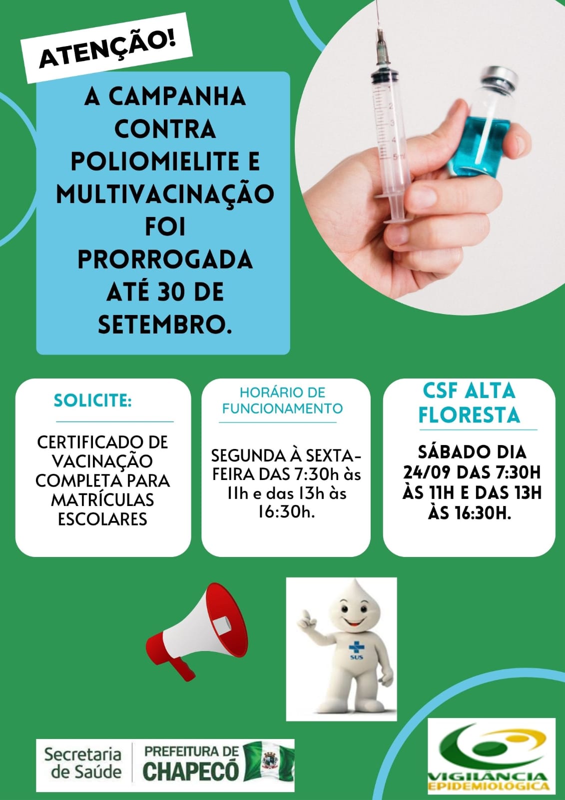 A Campanha Nacional de Vacinação contra a poliomielite iniciada no dia 8 de agosto que se estenderia até o dia 9 de setembro, foi prorrogada pelo Ministério da Saúde. O Município de Chapeco além do horário normal durante a semana tem estendido a campanha de vacinação. No próximo sábado, dia 24, o posto de saúde do Bairro Alta Floresta estará aberto das 7h30 às 11h e das 13h às 16h30, ampliando a cobertura vacinal. O calendário Nacional de vacinação é composto de 18 vacinas para crianças e adolescentes. A multivacinação prossegue até o final do mês de setembro. Aproximadamente 40 mil postos de saúde em todo o Brasil continuarão abertos.