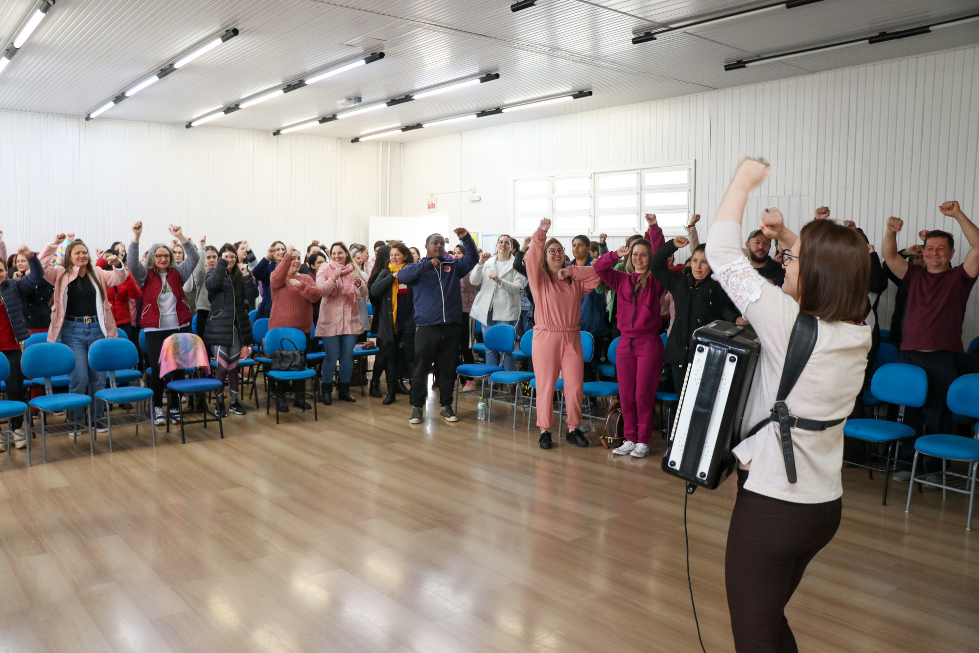 Os professores de Educação Física que atuam na Educação Infantil participaram da formação com a temática Educação Física COM a Educação Infantil: possibilidades de aprendizagens no cotidiano escolar, para reconhecer as crianças como sujeitos, como organizar e utilizar espaços, materiais e as diferentes linguagens, potencializando a brincadeira como prioridade na infância.