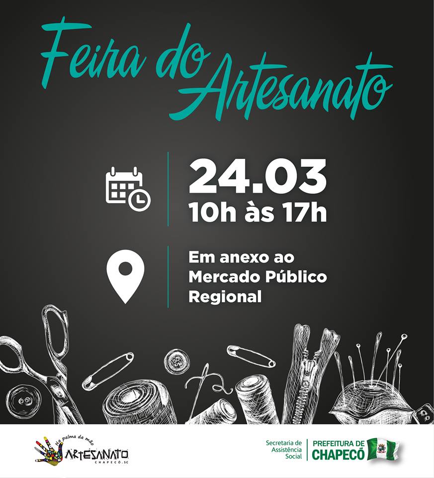 Dia 19 de março é celebrado o Dia do Artesão. Para marcar a data, a Administração Municipal, por meio da Secretaria de Assistência Social realizará no sábado (24/03) uma Feira de Artesanato. Ela acontecerá das 10 às 17 horas, no estacionamento no Centro Público de Economia Solidária Mario Faccio, na Avenida Nereu Ramos, 1750 E, bairro Passo dos Fortes em Chapecó, anexo ao Mercado Publico Regional. O objetivo é divulgar e comercializar artesanato.