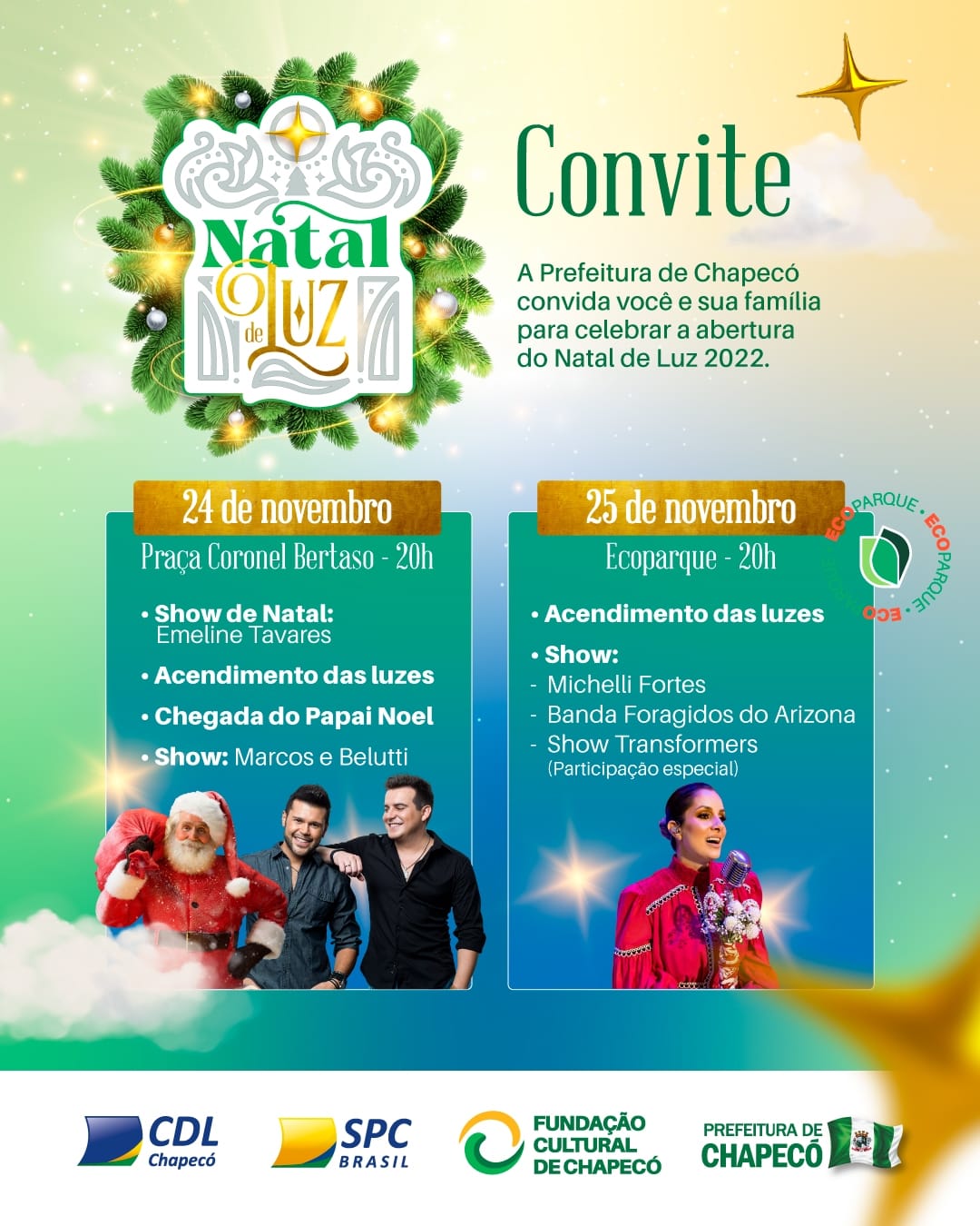 A Programação Natalina de Chapecó inicia na próxima quinta-feira, a partir das 20h, com chegada do Papai Noel, inauguração da iluminação, show nacional de Marcos & Belutti e show local com Emeline Tavares.