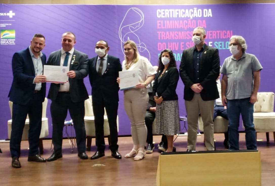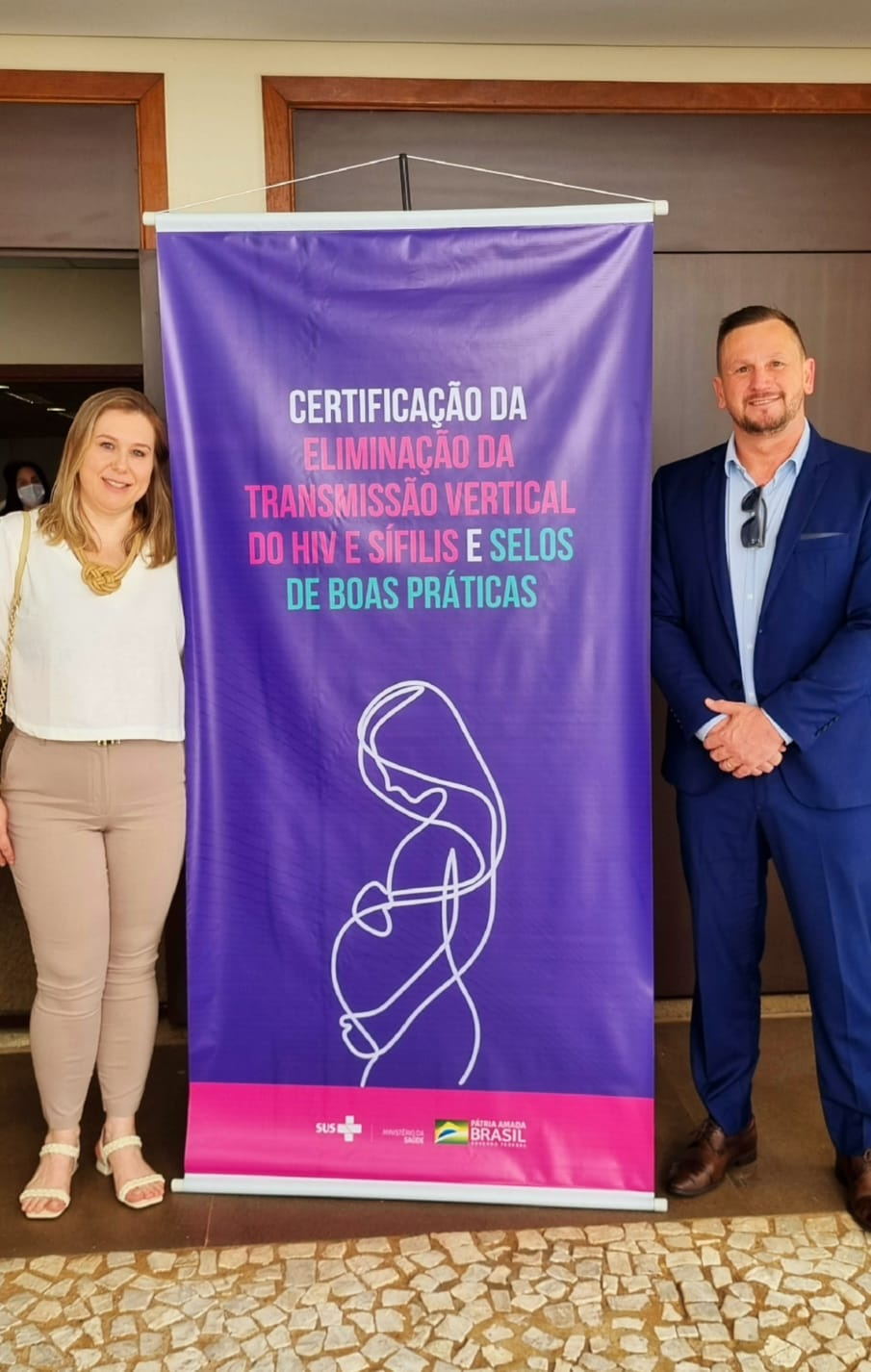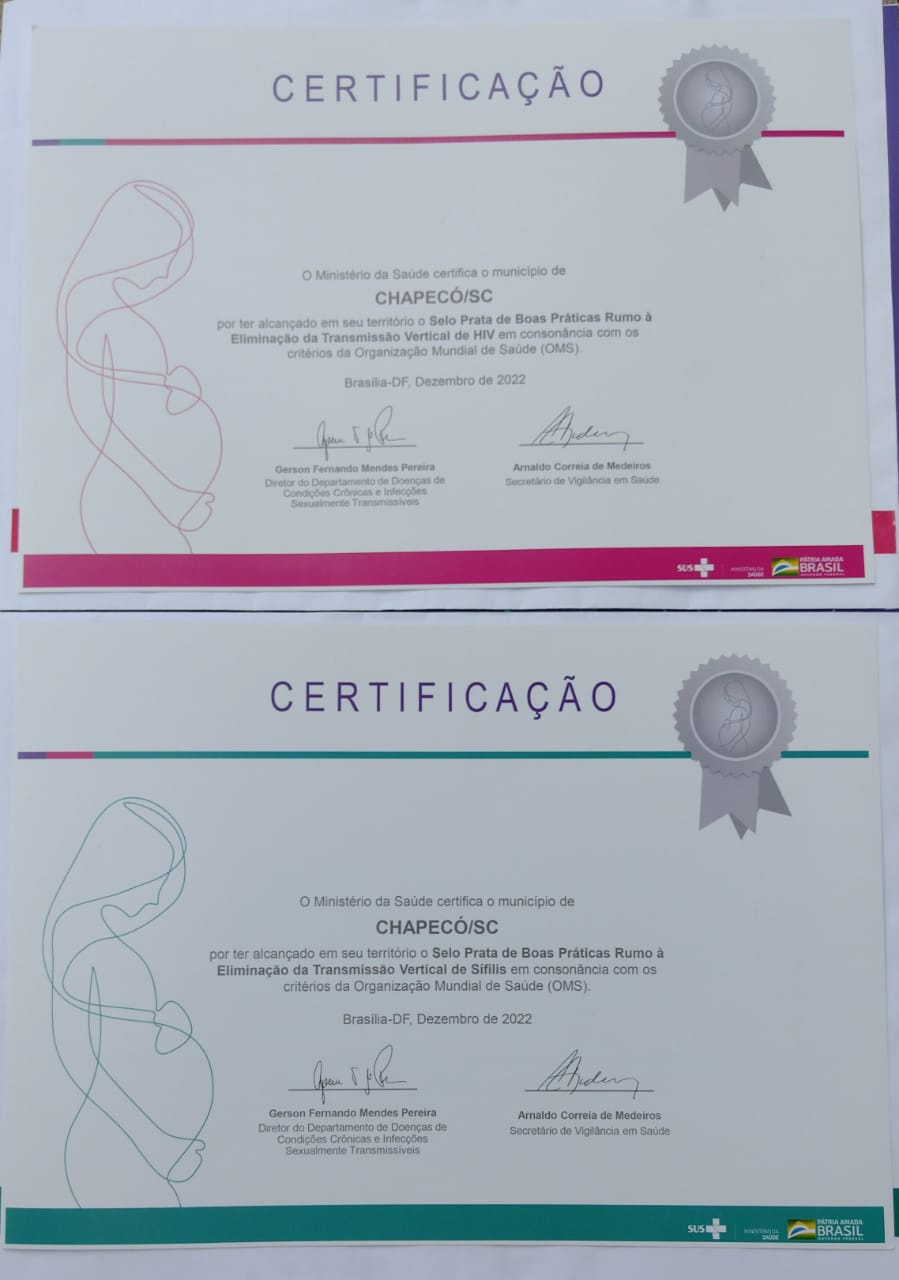 O Município de Chapecó recebeu do Ministério da Saúde, nesta quarta-feira, Selos Prata de Boas Práticas Rumo à Eliminação da Transmissão Vertical de HIV e de Sífilis. A transmissão vertical é a de mãe para filho. O secretário de Saúde, Jader Adriel Danielli, e Laisa Jantsch Bandeira, da Vigilância Epidemiológica, estiveram representando o Município na solenidade realizada no Auditório da Fiocruz Brasília.