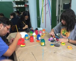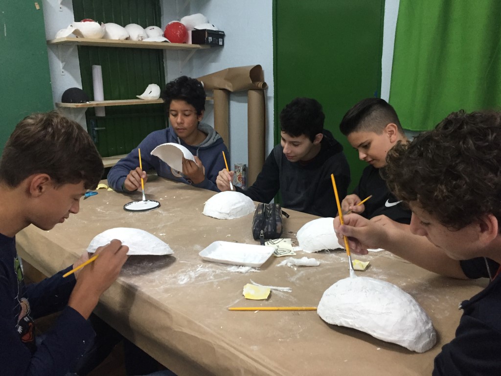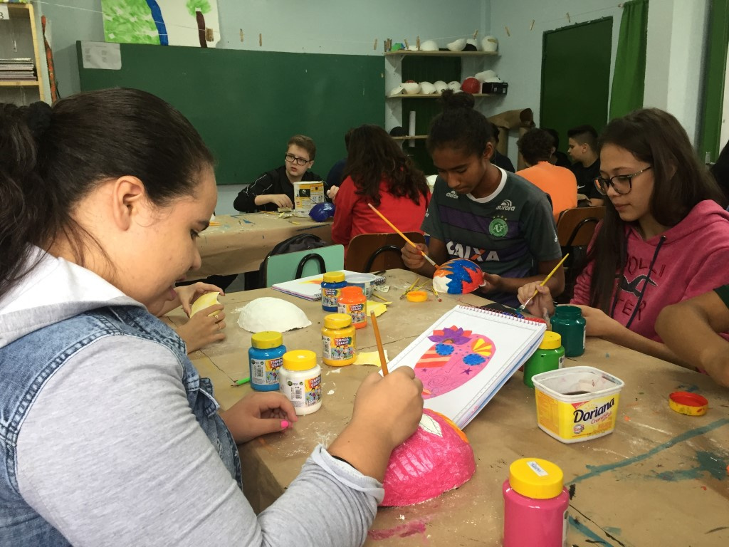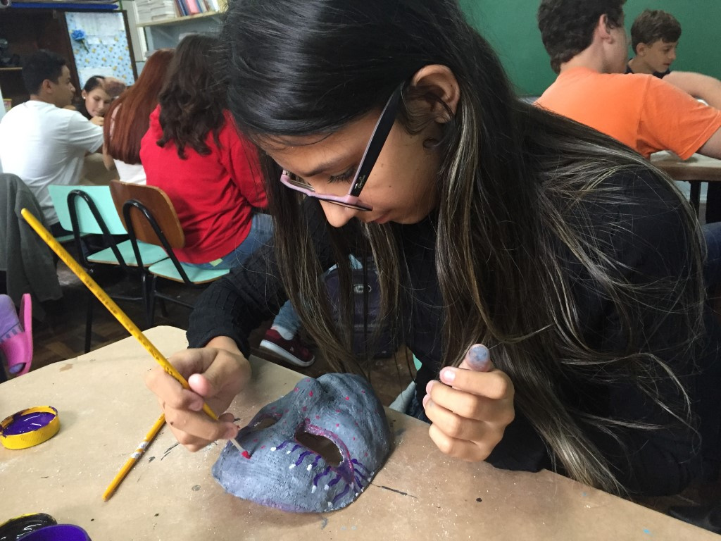 Aos poucos, o que era uma bexiga de ar encoberta com gesso e tinta acrílica branca começa ganhar formas e cores através do manuseio e da sensibilidade dos estudantes do 9º ano da Escola Básica Municipal Sereno Soprana. De acordo com a professora de Arte, Elizandra Aparecida De Almeida Bet, dentro da arte brasileira é trabalhado com os alunos a arte indígena e a partir do conteúdo estudado, os alunos são motivados a criar máscaras. A experimentação de diferentes materiais, criatividade, senso crítico, cores e trabalho coletivo embasou o trabalho, visando propiciar aos estudantes uma compreensão aprofundada da arte indígena ligada às questões sociais, possibilitando percepção através dos sentidos, das imagens, dos sons, das impressões ou das sensações externas a partir da vivência de cada um, transformar em arte própria, explicou.