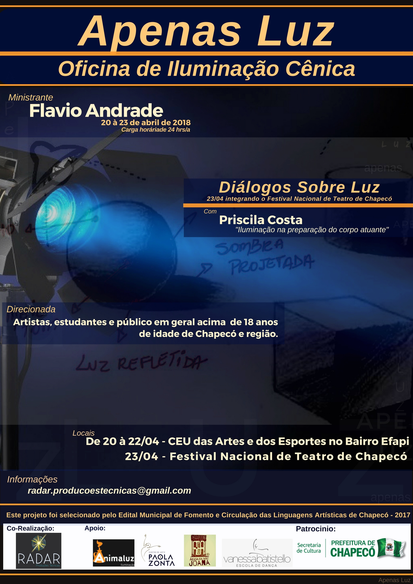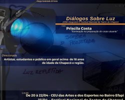 Estão abertas as inscrições para a oficina gratuita de iluminação cênica Apenas Luz, contemplada pelo Edital de Fomento e Circulação das Linguagens Artísticas de Chapecó. O projeto oportuniza a capacitação de profissionais nesta área, sendo a primeira formação cenotécnica oferecida na região oeste. O intuito é proporcionar o desenvolvimento de habilidades técnicas para o ofício de iluminador cênico.