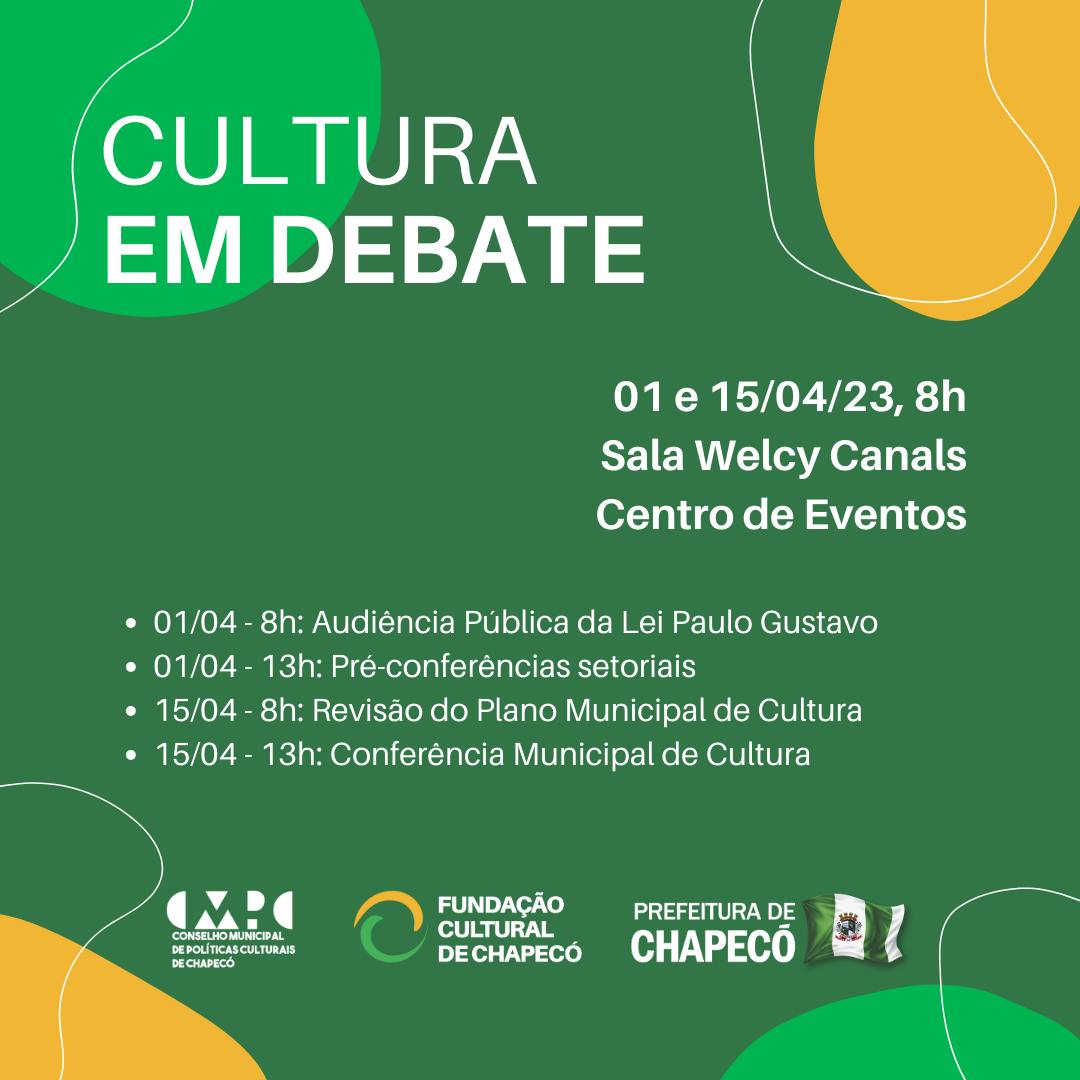 A Fundação Cultural de Chapecó anunciou a realização do Cultura em Debate. A iniciativa, que ocorrerá nos dias 1º e 15 de abril, contará com uma série de conferências e audiências públicas, que terão como objetivo discutir, aprimorar e definir as diretrizes das políticas culturais que serão desenvolvidas em Chapecó no ano de 2023.