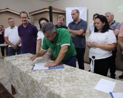 A ordem de serviço para iniciar as obras do Centro Multiuso do Bairro Santo Antônio, autorização de licitação para a Arena Chapecó e asfalto em diversas ruas fazem parte do pacote de R$ 65 milhões em obras anunciadas na noite desta quarta-feira, pelo prefeito João Rodrigues, no Centro Comunitário do Bairro Santo Antônio.