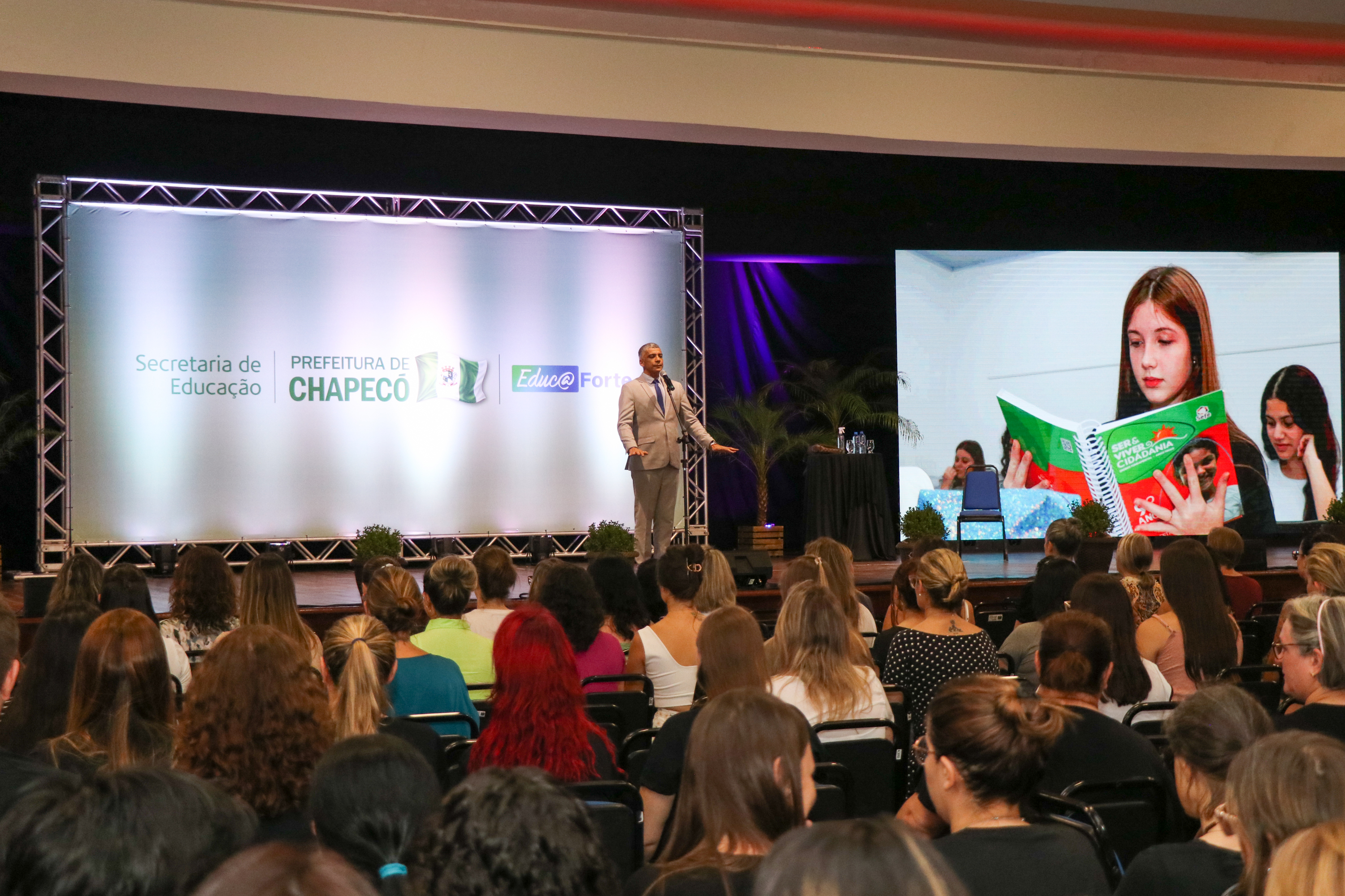 A secretaria de Educação busca trazer palestrantes que façam a diferença e possam compartilhar suas experiências com todos aqueles que estão ligados ao processo de ensino-aprendizagem. O tema apresentado hoje, nos faz pensar na humanização na educação, na importância dela e como podemos fazer e ser um diferencial para crianças e adolescentes, disse a Secretária de Educação, Astrit Tozzo.