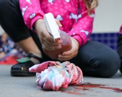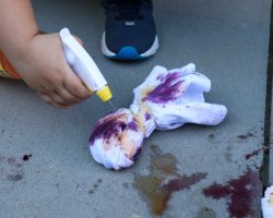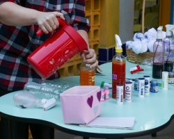 Aos poucos, a tinta diluída em água foi borrifada nas peças até chegar no tom desejado. Feito isso, as amarrações foram desfeitas, as camisetas foram penduradas no varal e deixadas para secar. A aluna Laís Munarini, de três anos, foi muito criativa e revelou: Eu amo a cor rosa, por isso foi a que mais usei. Minha camiseta ficou linda!.