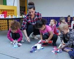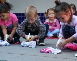 Na tarde de quarta-feira (24), a turma de crianças bem pequenas (CBP B) do CEIM Oracílio Costella fez uma camiseta tie dye, sob coordenação da professora Kamila Scopel Zanella. A proposta surgiu a partir da curiosidade e do interesse das crianças em investigar o universo das cores e suas possibilidades.