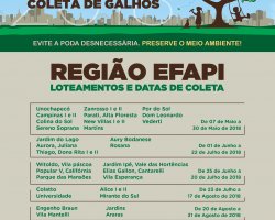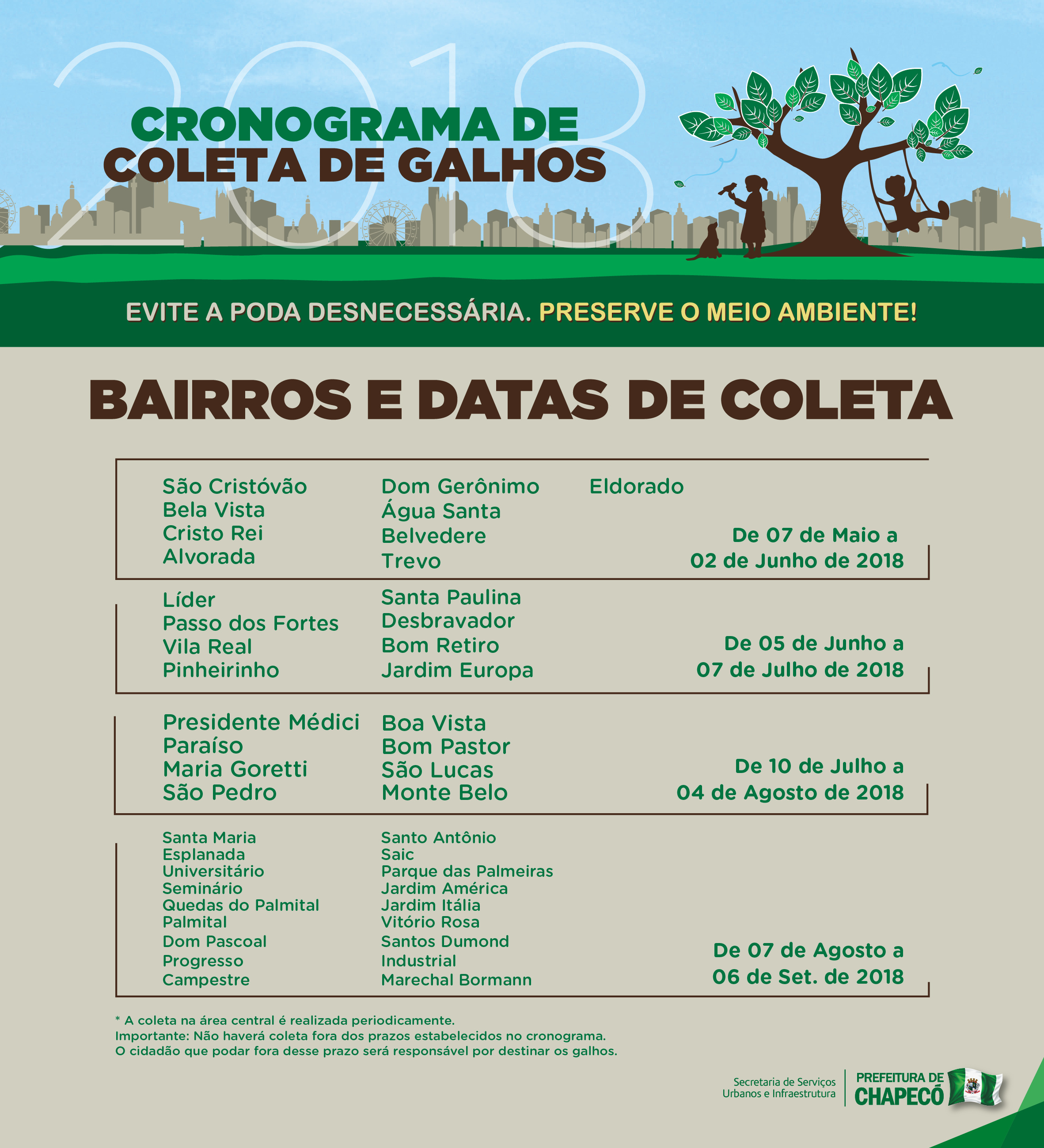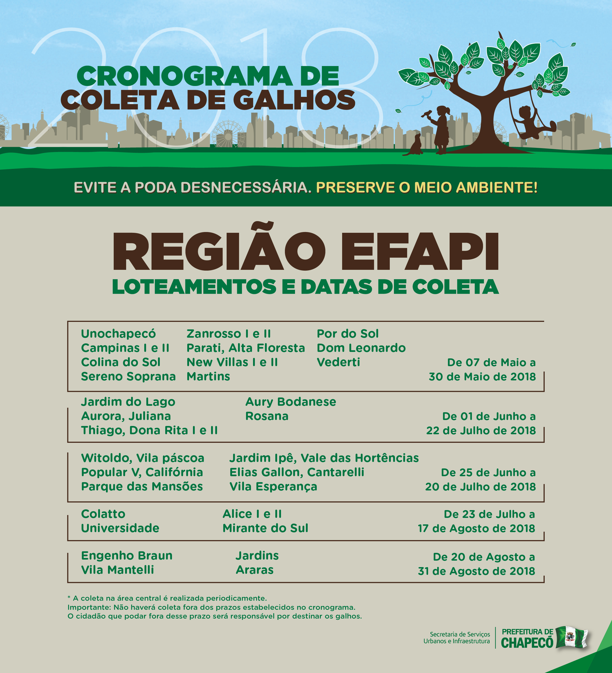 A coleta inicia no dia 07 de maio e prossegue até o dia 06 de setembro, passando pelos principais bairros, na área central e uma esquipe específica para atender a região da grande Efapi. Realizada em parceria entra a Secretaria de Infraestrutura Urbana e Superintendência da Efapi, a proposta da Administração Municipal é auxiliar a população no período de poda de árvores, dando o destino adequado aos galhos descartados.