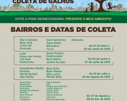 A Administração Municipal inicia o período de coleta de galhos na área urbana a partir do mês de maio. O cronograma com as datas específicas de recolhimento para cada localidade será feito por etapas, dividindo os serviços em regiões.