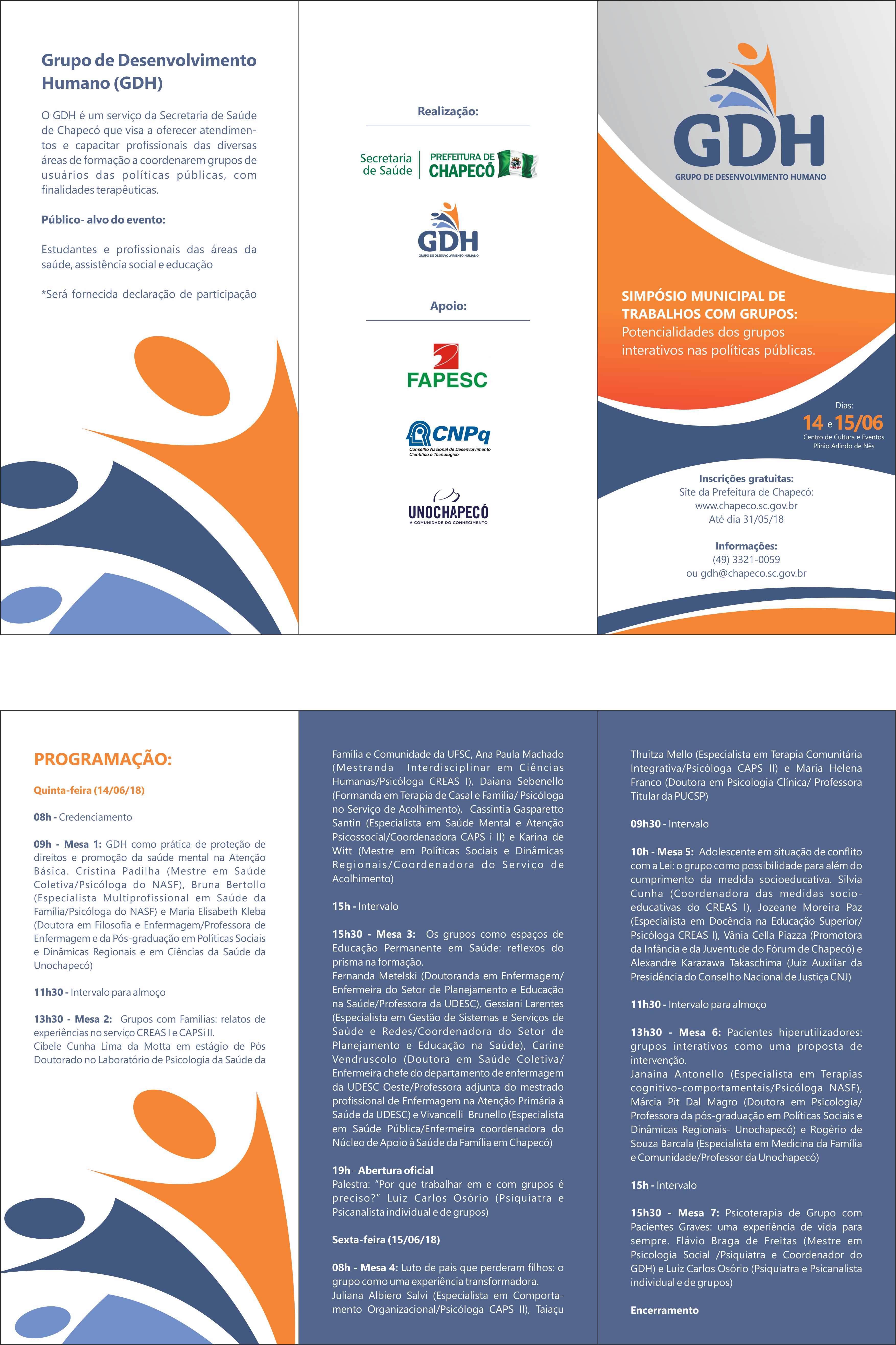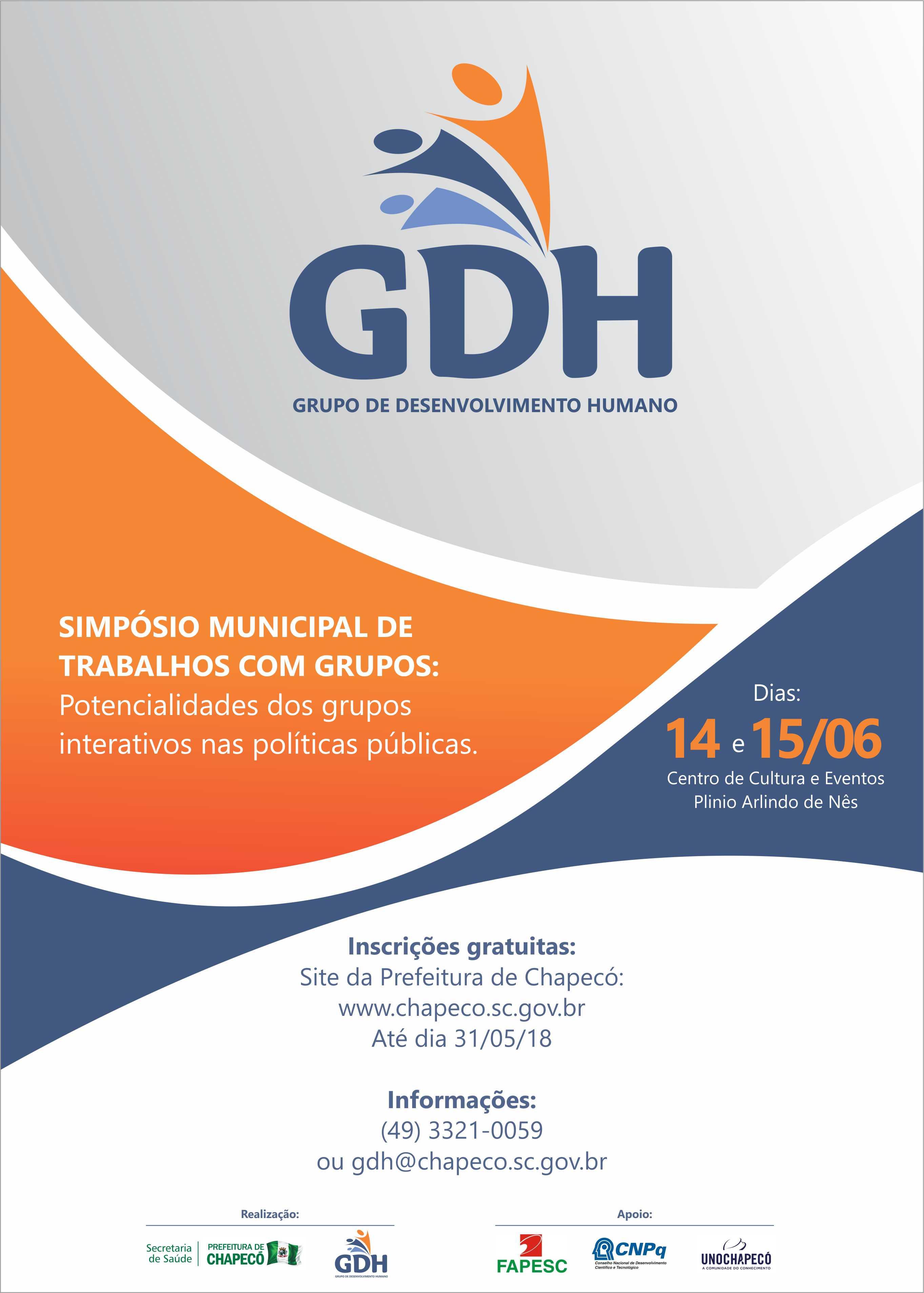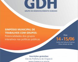 Por isso, acontecerá em Chapecó o Simpósio Municipal de trabalhos com grupos: Potencialidades aos grupos interativos nas politicas públicas acontecerá em Chapecó nos dias 14 e 15 de junho, no Centro de Cultura e Eventos Plínio Arlindo de Nes. O encontro é direcionado para estudantes e profissionais das áreas de saúde, assistência social e educação. Os interessados podem fazer a inscrição pelo site da prefeitura www.chapeco.sc.gov.br até o dia 31 de maio. Mais informações pelo telefone (49) 33210059 ou pelo e-mail gdh@chapeco.sc.gov.br. Faça sua inscrição no link https://goo.gl/forms/