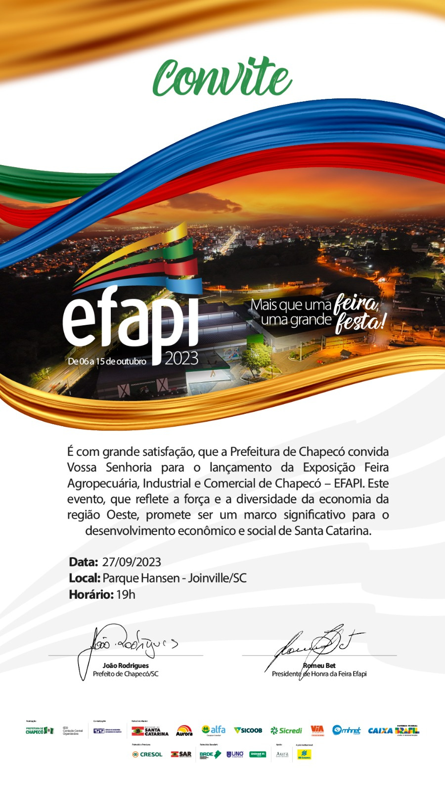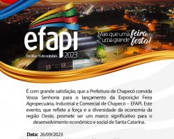 Com estes lançamentos regionais nós queremos mostrar a Efapi e o que ela representa, que é força da economia chapecoense e o crescimento de Chapecó. Também queremos convidar imprensa e as lideranças políticas, militares, judiciais e das forças de segurança para a abertura da feira. Também teremos 25 shows nacionais, disse João Rodrigues.