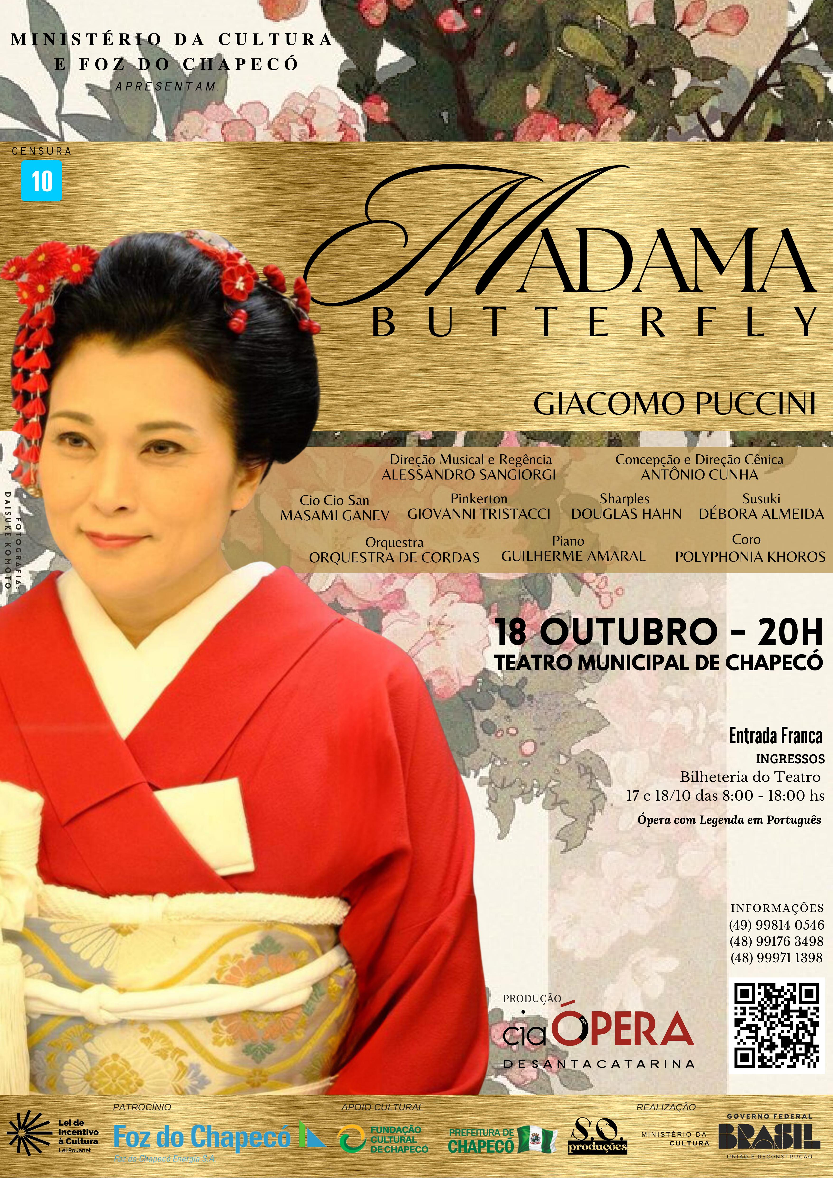 Dia 18 de outubro Chapecó assistirá uma das mais famosas óperas do mundo musical, Madama Butterfly, em mais uma esmerada produção da Cia Ópera de SC com a parceria da Fundação Cultural de Chapecó. O público poderá acompanhar, de forma gratuita, o enredo de amor e desilusão que passa-se em Nagasaki no início do século XX e narra uma história que revela faces dos costumes orientais da época. Madama Butterfly conta a trágica história de uma bela e jovem gueixa que sacrifica a família, a religião e a própria vida por amor ao marido americano.