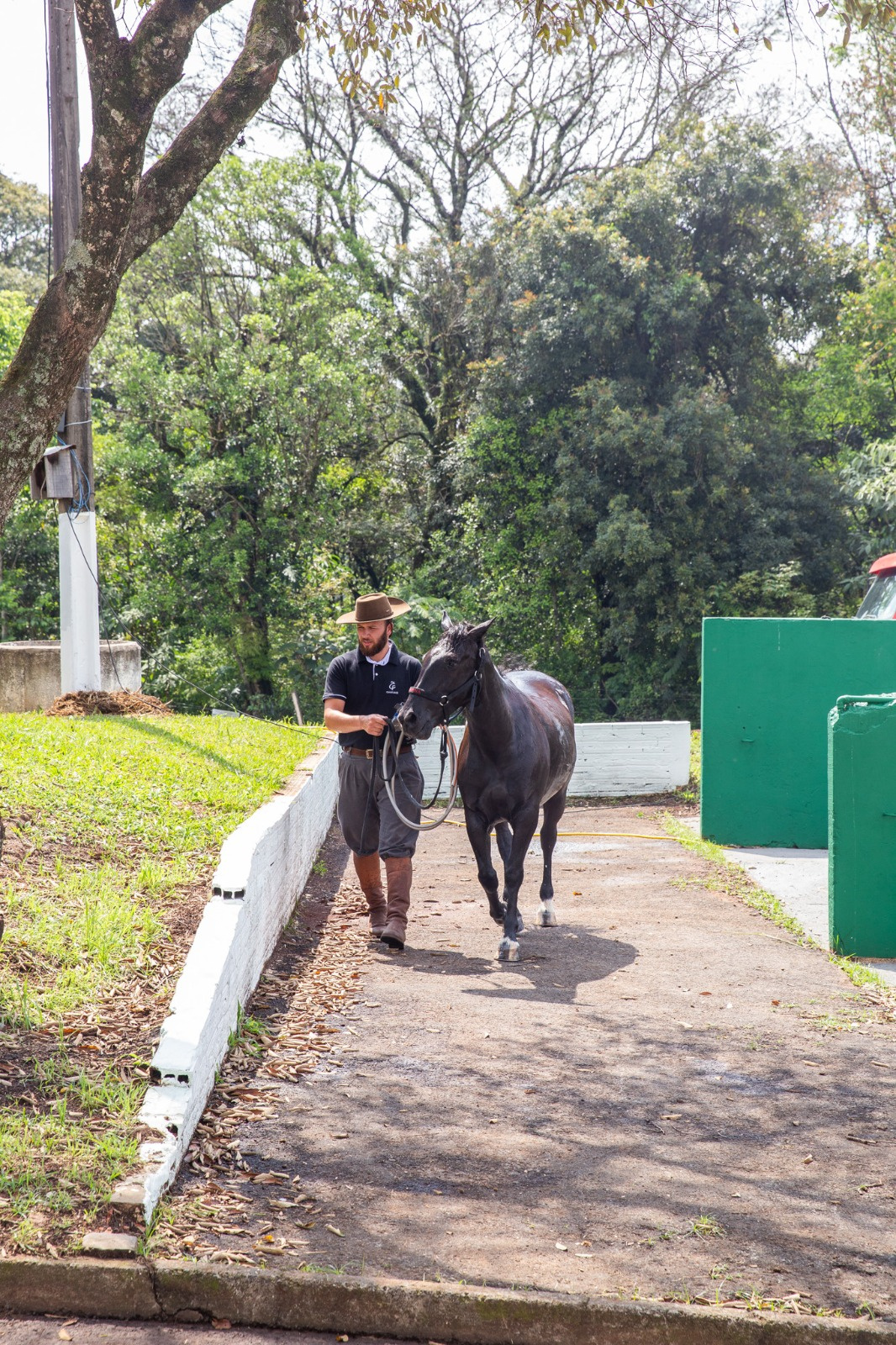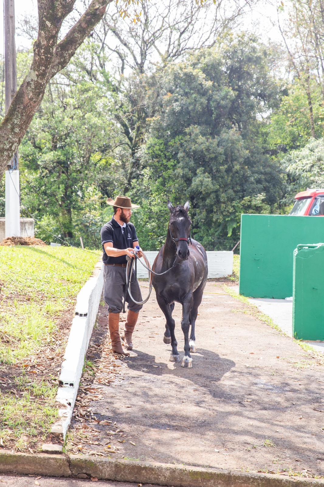 Elias Portela é o cuidador dos animais da fazenda há mais de um ano. Nesta quinta ele já deu banho e escovou a égua Chacota, para ficar bem bonita. Também a levou para um trote na pista, pois amanhã já começam a análise morfológica e as provas de Volta Sobre Patas, Esbarrada e Figura.