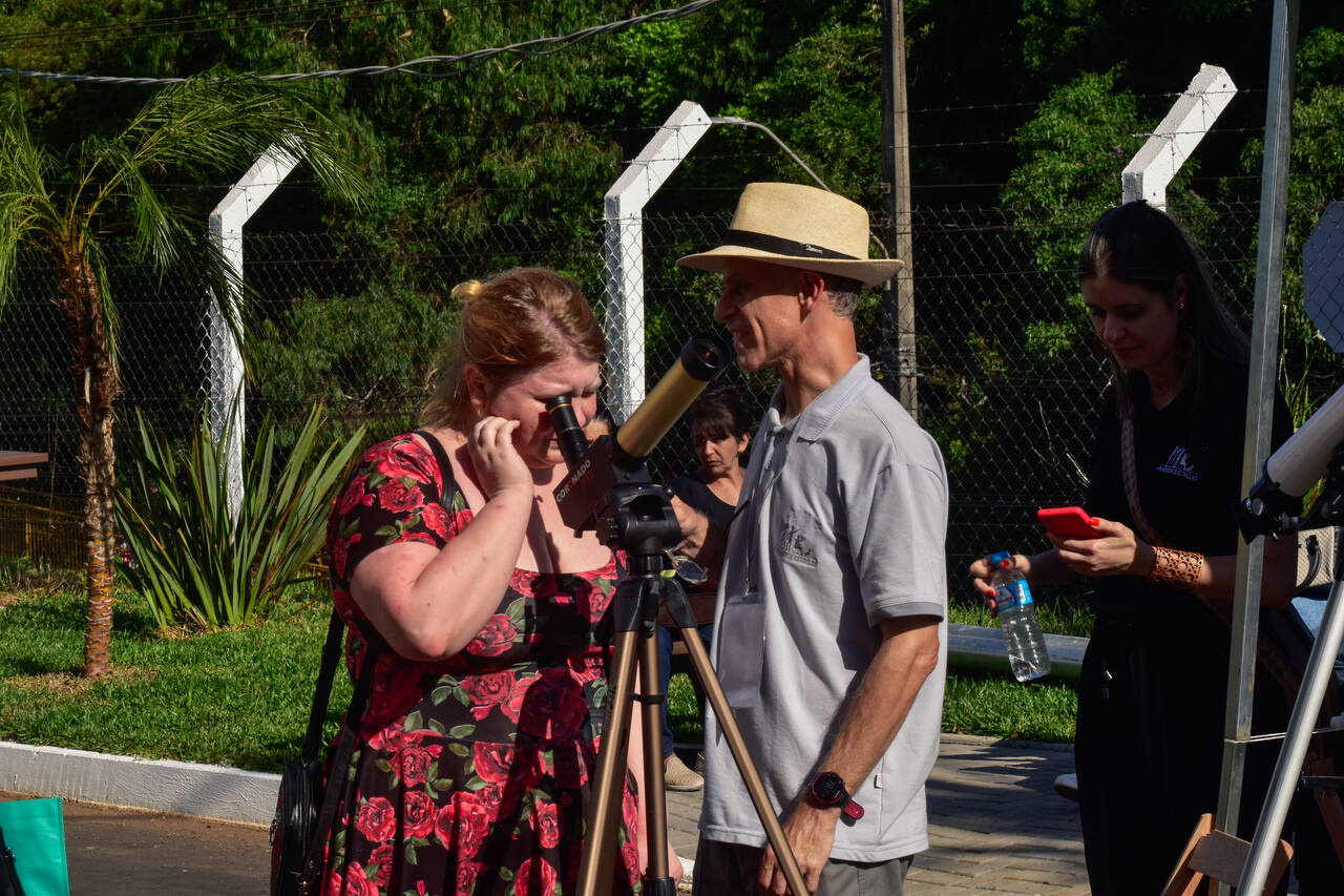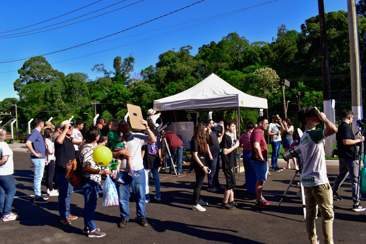 Professor da Udesc e membro da Associação Apontador de Estrelas, Daniel Iunes Raimann, conta que a associação realiza noites e dias de observação, e que foi um acaso acontecer o eclipse durante a Feira. "Trouxemos os telescópios da universidade e dos membros da associação para a disposição do público, com filtros adequados para observar o eclipse sem acarretar em lesões oculares. São sete telescópios no total, além de filtros manuais", comenta. Além disso, ele cita alguns cuidados para observar o evento com segurança. "É aconselhado o uso de filtro de máscara de solda, número 14. Também pode ser feito um furo em papel alumínio e deixar passar a luz solar, formará o disco solar. E não utilizar chapas de raio-x ou óculos escuros para observar, pois não protege contra a radiação", salienta.