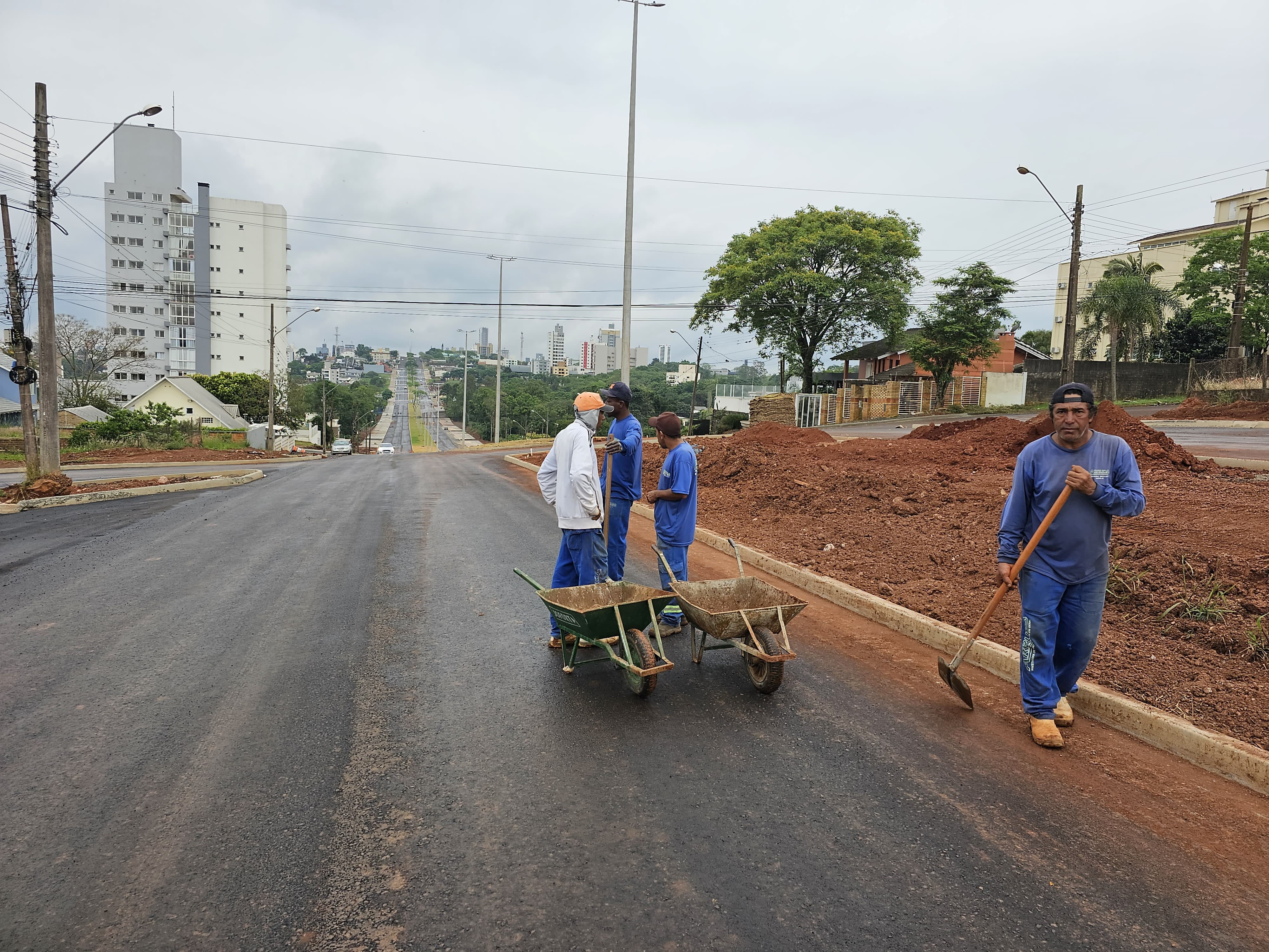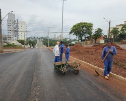 Também estão em andamento obras de colocação de paver nos passeios, e nivelamento e colocação de grama no canteiro central.