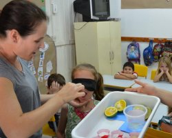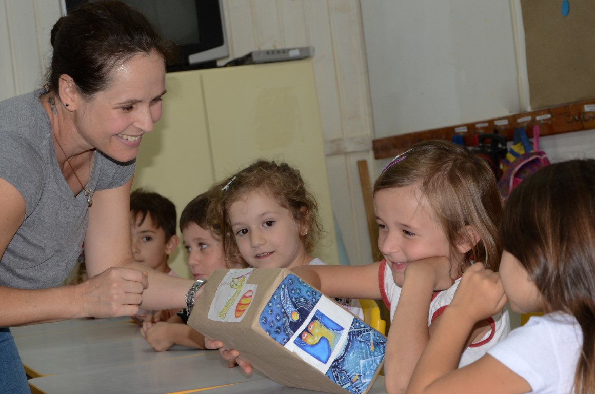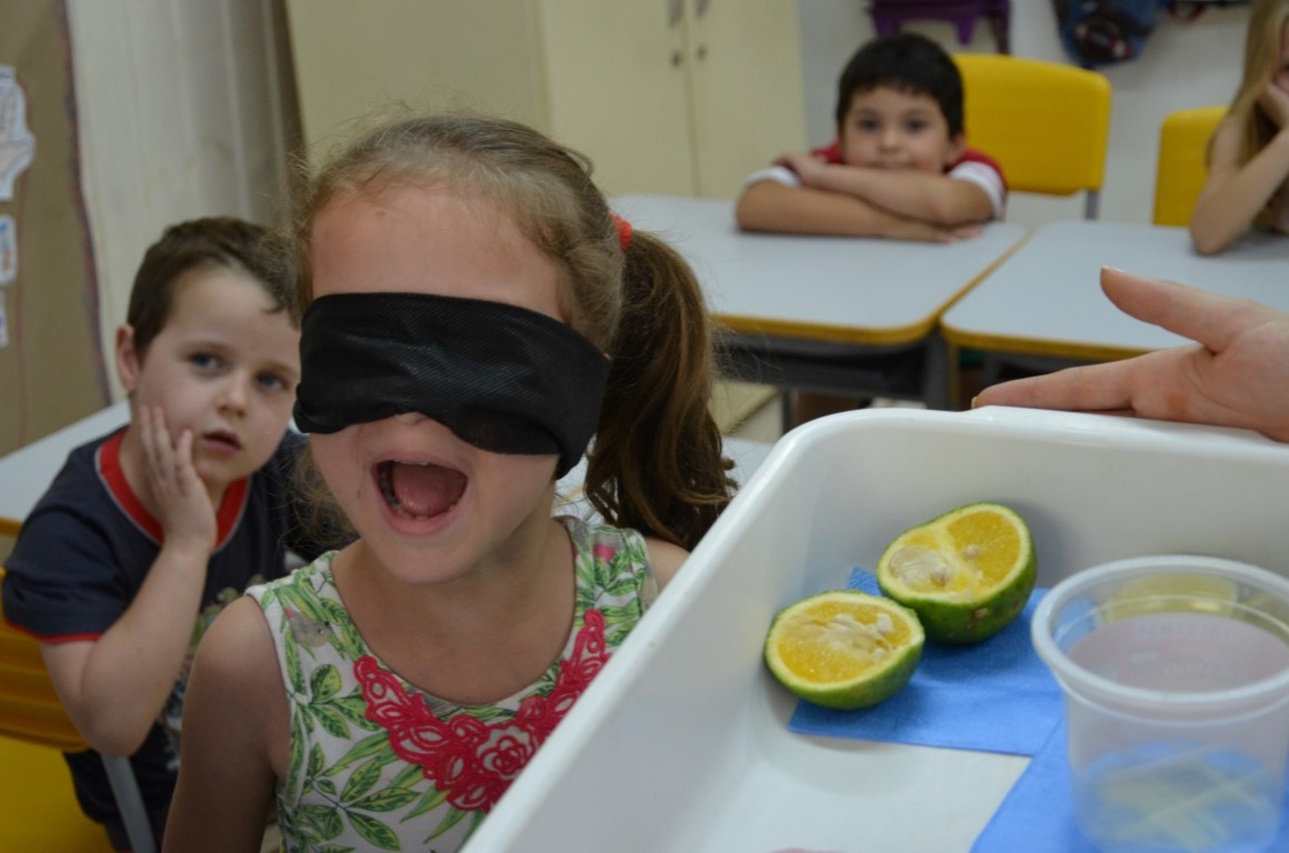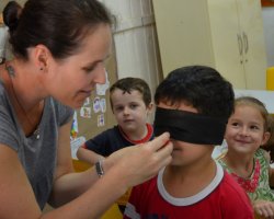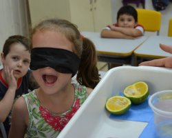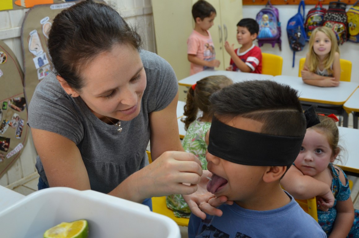 A professora destacou ainda que foi realizada a atividade da caixa mágica, que permite identificar as diferentes texturas e formas. A faixa etária deles permite que percebam que o corpo deles está crescendo. A caixa dos sentidos faz com que apurem o sentido do tato e para aguçar o olfato e o paladar, usamos a experimentação dos cheiros e gostos com os olhos vendados. É gratificante, pois, eles compreenderam o funcionamento do corpo de forma simplificada, explicou.