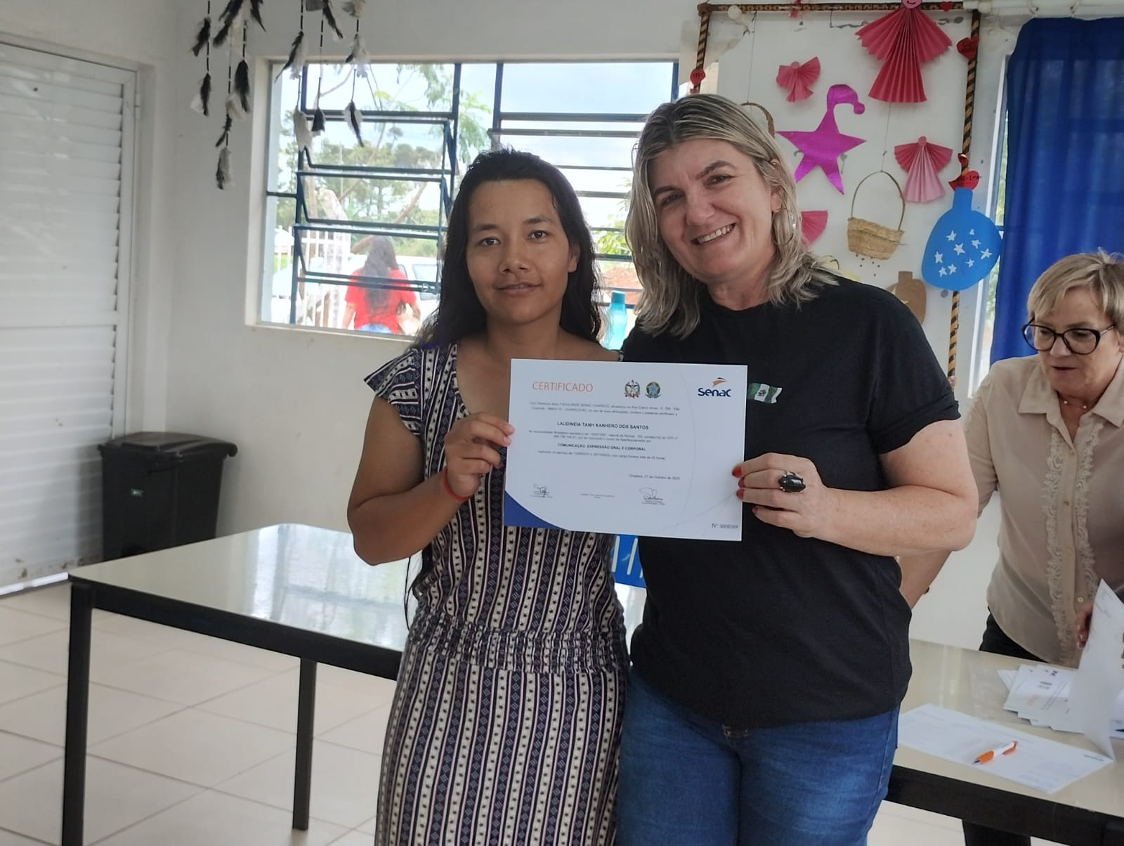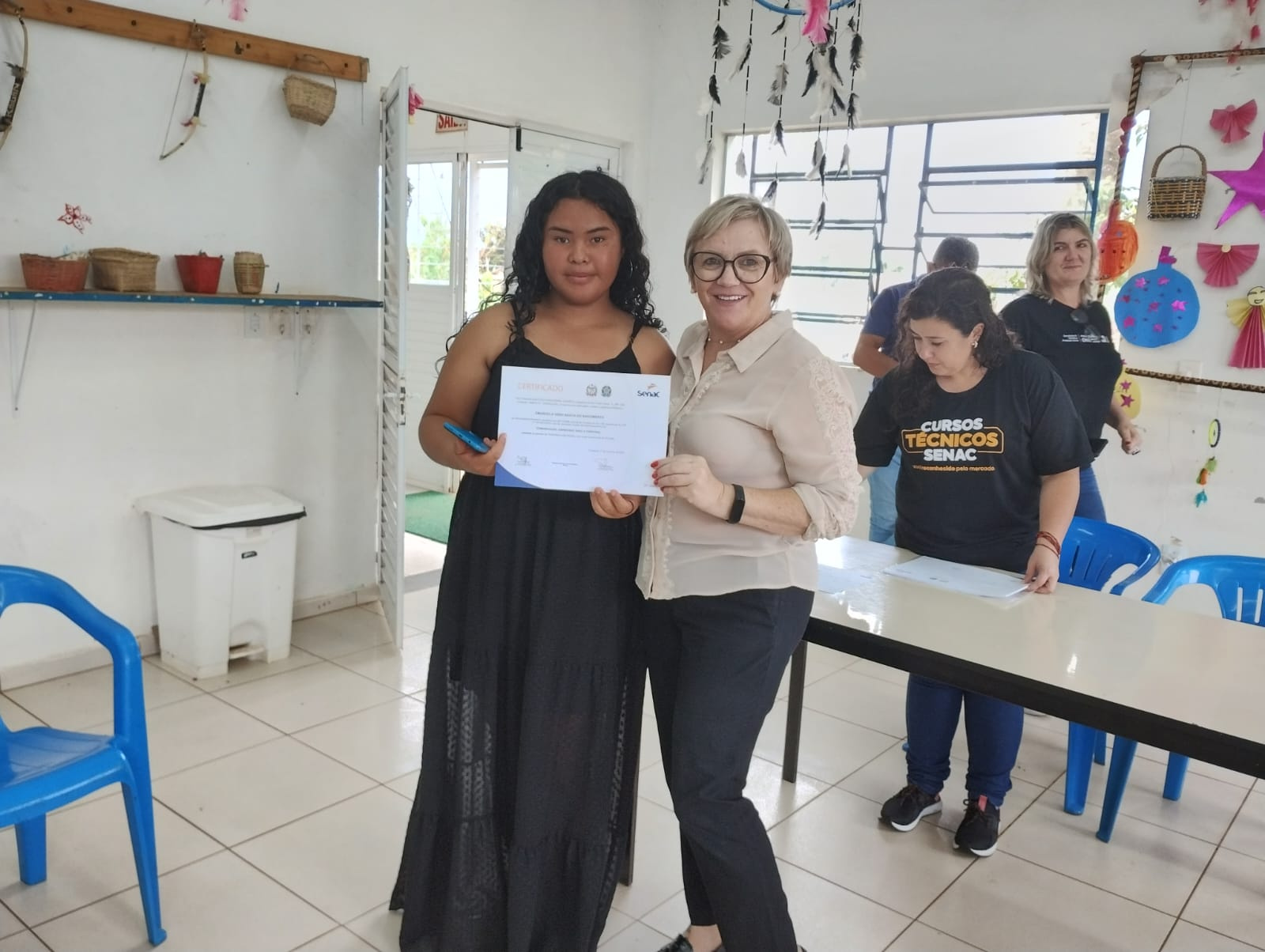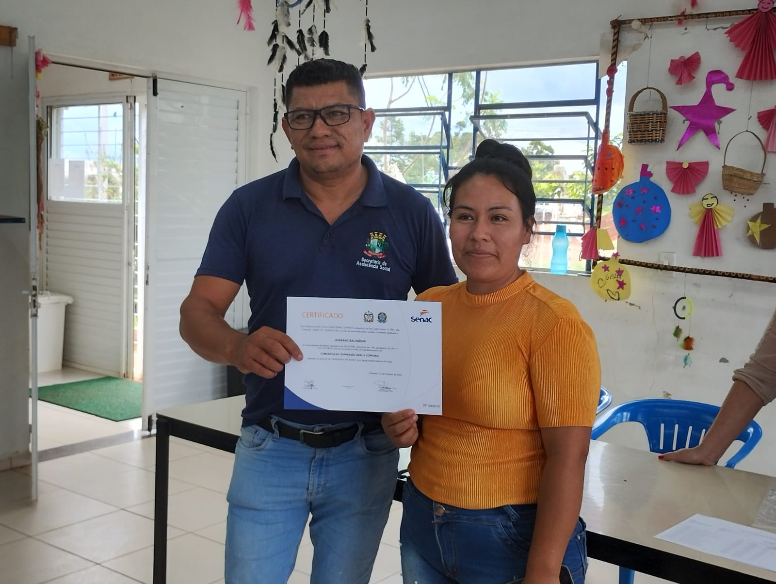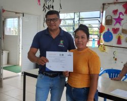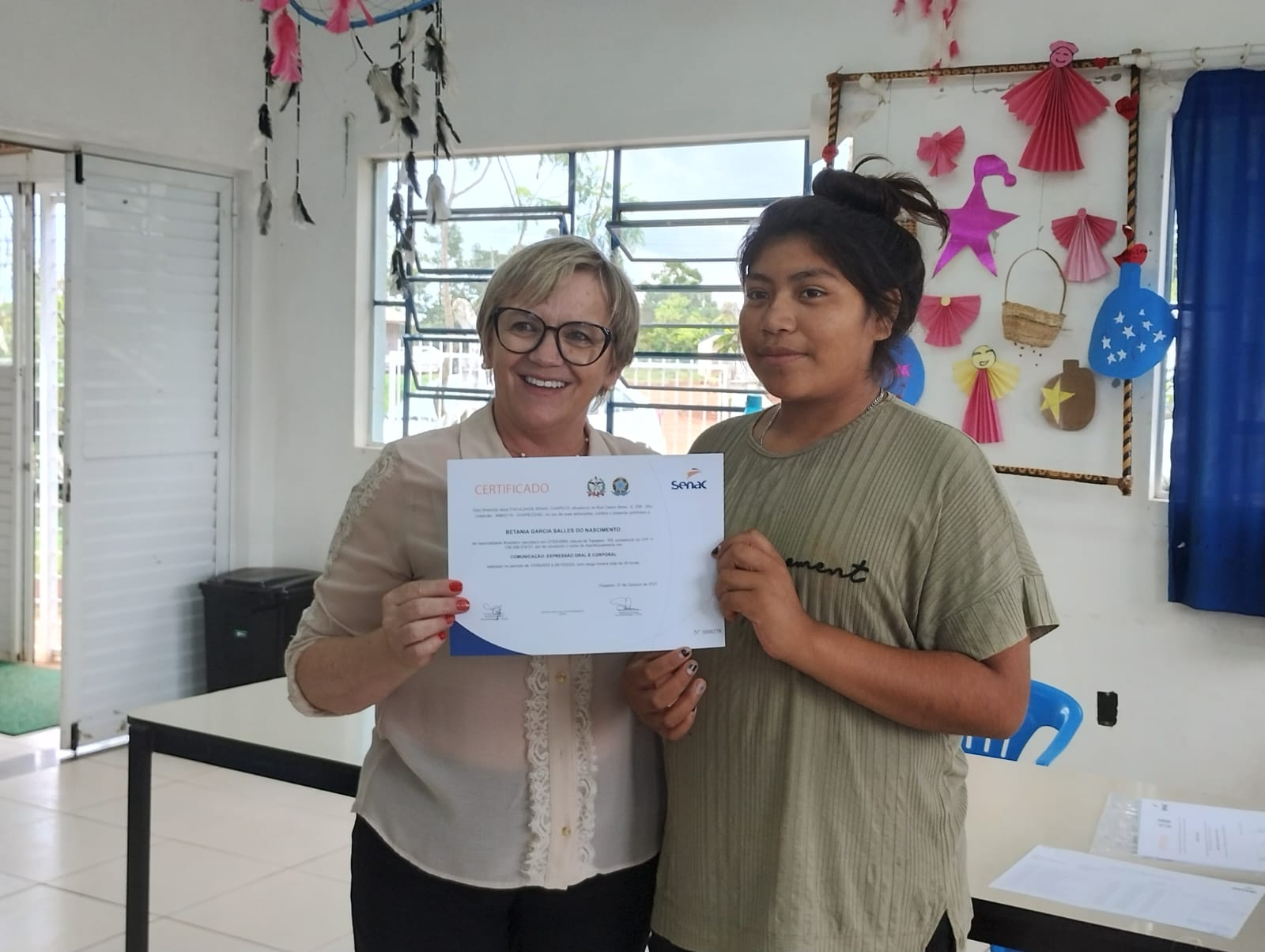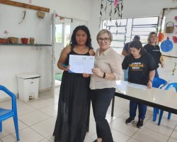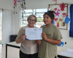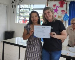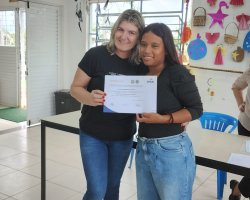 Os 19 alunos que participaram do curso de Comunicação Expressão Oral e Corporal na Aldeia Kondá, em Chapecó, receberam na tarde desta terça-feira (05) os certificados de conclusão. O curso foi realizado pela SENAC e teve carga horária de 20 horas de duração. Estiveram presentes a Secretária da Família e Proteção Social, Isabel Trierveiler Machado, o Gerente Indígena, Valmir Fernandes, a coordenadora de equipe do Oportuniza Chapecó Jussara Broca e a coordenadora do Senac Tatiana da Silva.