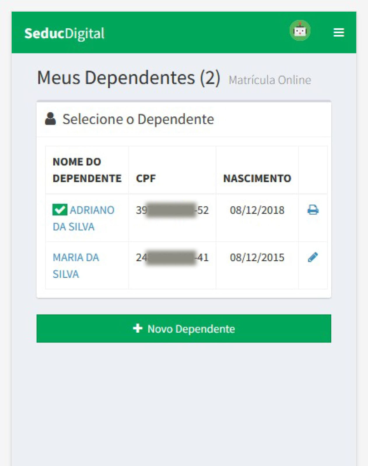 Para aqueles que farão o cadastro pela primeira vez: clique em Primeiro Acesso e, em seguida, preencha os dados solicitados dos pais ou responsáveis legais. No próximo passo, acesse a opção + Novo Dependente e digite o CPF, data de nascimento e o nome completo do filho. No campo PCD, selecione a opção caso a criança ou adolescente tenha laudo médico para deficiência: intelectual, física, auditiva, visual e/ou deficiência múltipla, surdocegueira, transtorno do espectro autista ou atraso global do desenvolvimento, conforme o Artigo 4º, inciso VIII do edital. Na sequência, clique em Salvar. Para informar os demais dependentes que desejam concorrer às vagas, repita as mesmas ações.