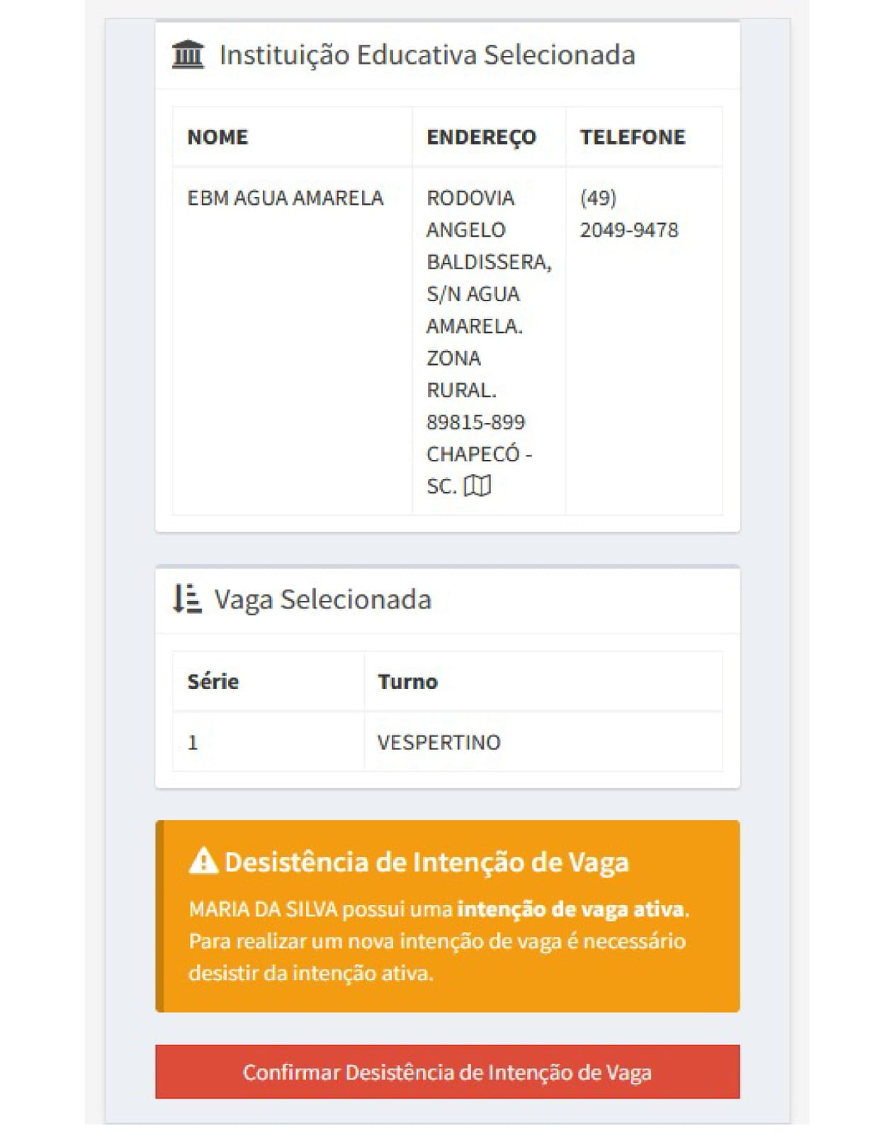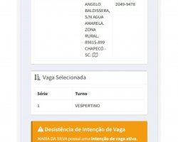 Para desistir da vaga, basta acessar o sistema em Já sou Cadastrado e informar o CPF e data de nascimento do responsável para acessar o sistema. Na tela seguinte, aparecerá o nome de todos os dependentes cadastrados. Aquele que estiver com o símbolo verde ao lado indica que o aluno já teve a matrícula efetuada e não será possível a alteração. Os demais que não apresentarem a opção devem clicar no nome da criança, destacado em azul. Na próxima tela, será apresentada a vaga onde ela está aguardando na fila de espera. Logo abaixo, aparecerá o campo para selecionar a desistência da vaga.