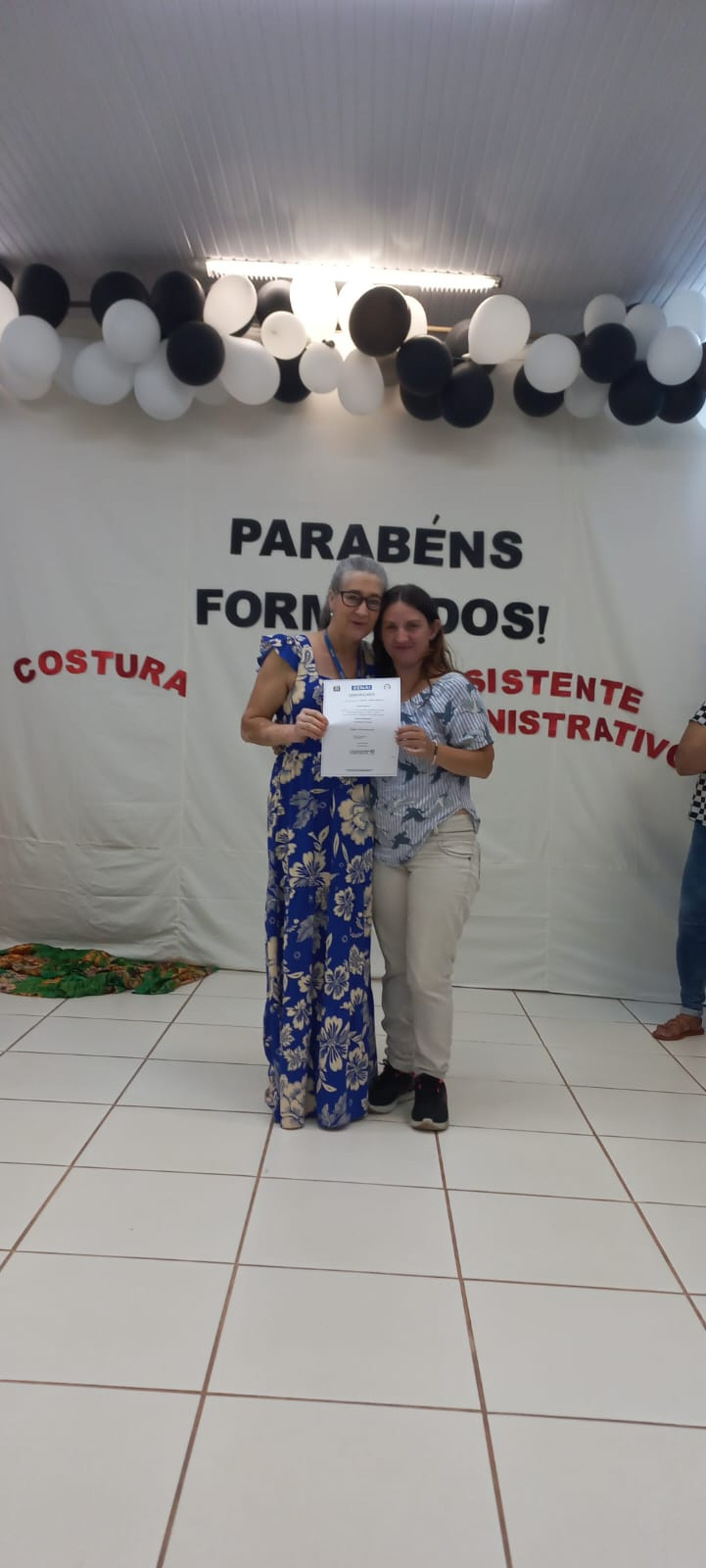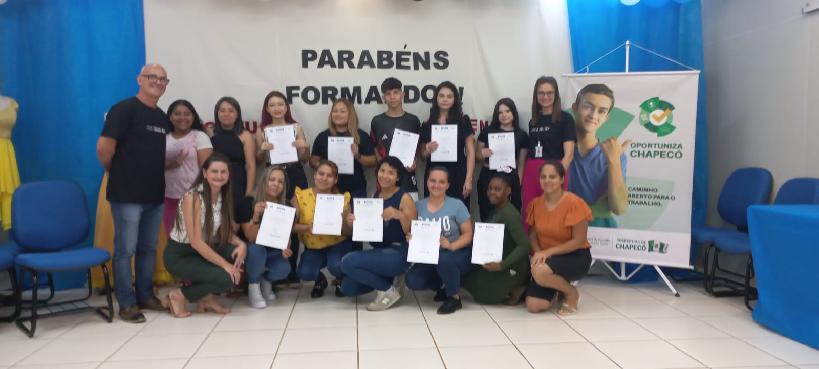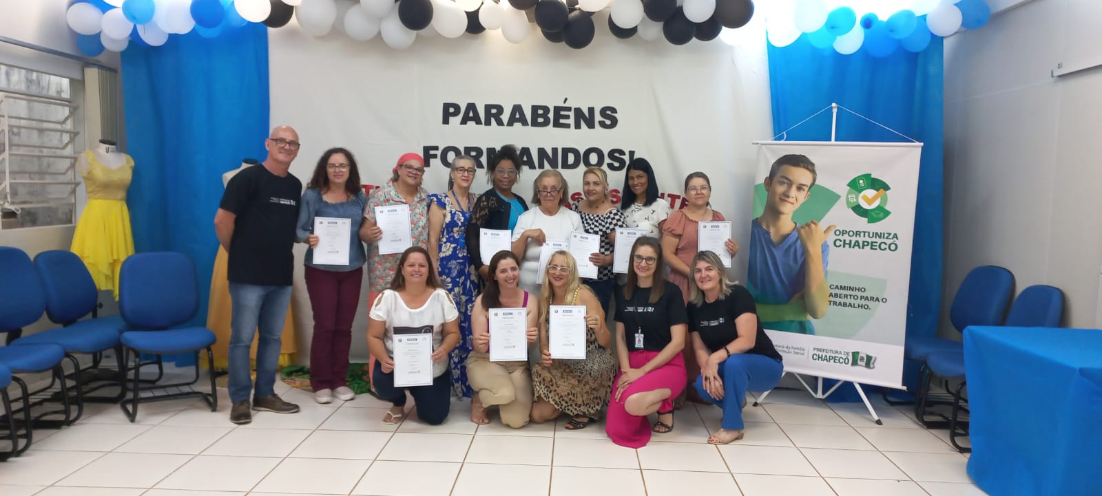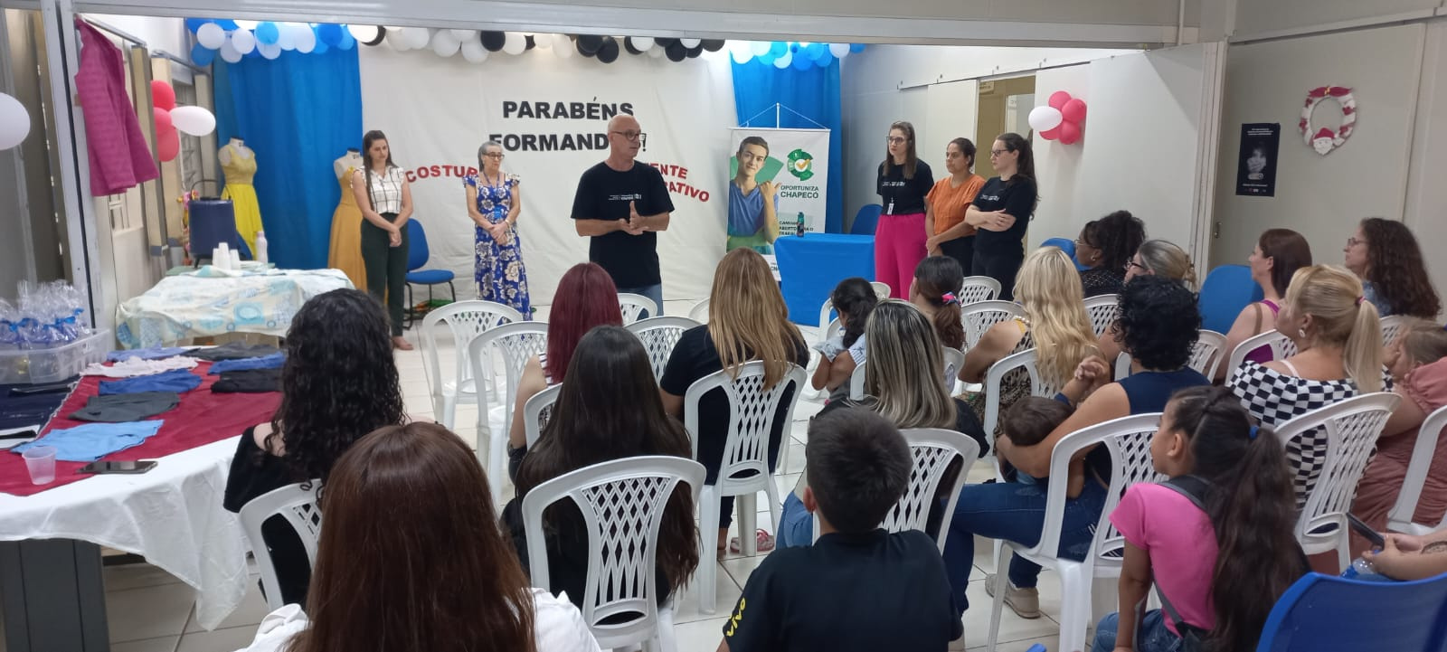 Os certificados dos alunos dos cursos de Costura Básica, Costura intermediária e Assistente Administrativo, oferecidos pelo Oportuniza Chapecó, foram entregues nesta quinta-feira (13). Foram 40 alunos, totalizando 180 horas de curso. As aulas aconteceram no Centro de Qualificação Profissional na Efapi.