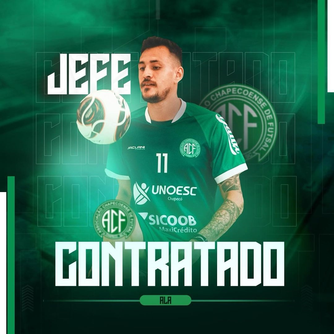 Jefe Seco é outro que disputou a LNF em 2023 a estar na Chape Futsal. Após uma temporada no Blumenau, o ala agora defenderá a equipe da cidade onde nasceu. O ala chapecoense, 28 anos, jogará pela segunda vez pelo Verdão das Quadras. Entre a saída de Chapecó e a participação na Liga, ele atuou nos franceses KB United e Nantes Métropole onde foi campeão da Copa da França e Pinhalense. Jefe Seco iniciou a trajetória adulta na AD Saudades.