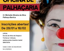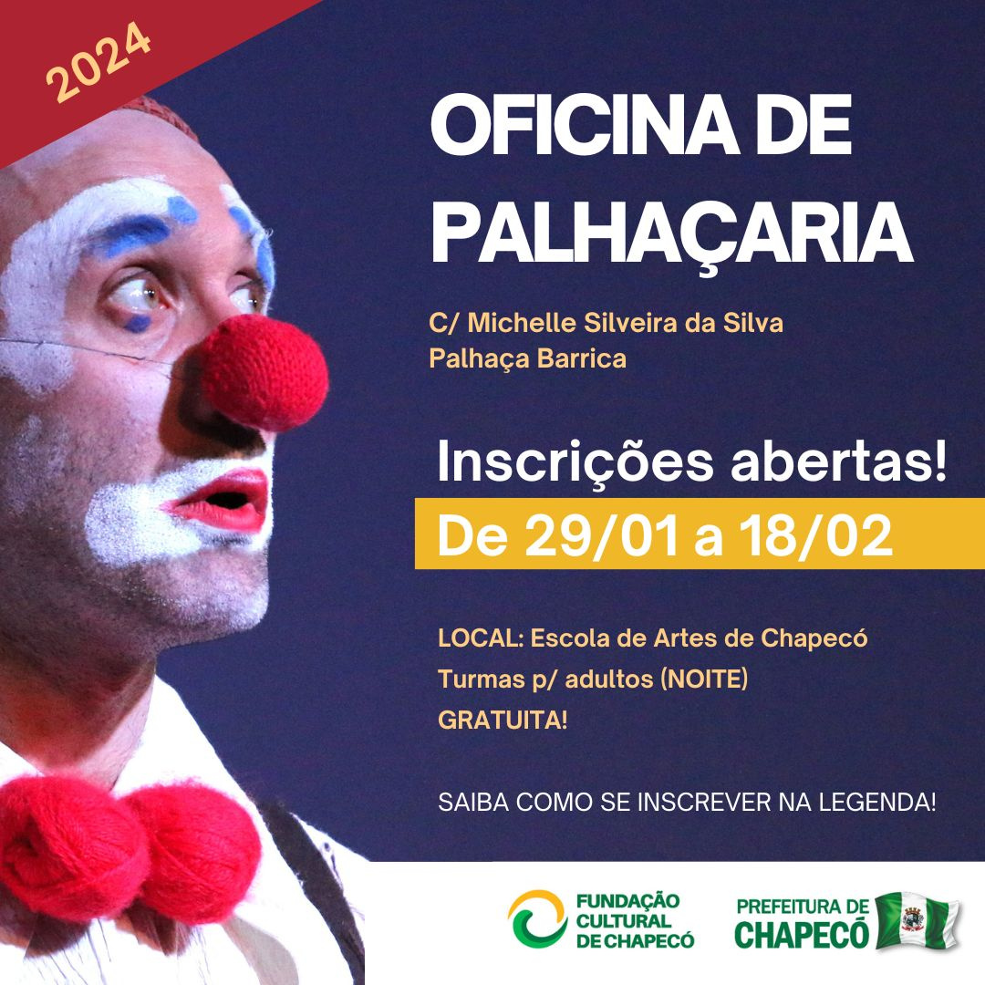 A Fundação Cultural de Chapecó oferecerá uma Oficina de Palhaçaria, ministrada pela artista Michele Silveira da Silva, criadora e intérprete da Palhaça Barrica. As inscrições são gratuitas e estão disponíveis no http://bit.ly/3HFQXQ9. As inscrições iniciaram na segunda-feira (29) e seguem até 18 de fevereiro.