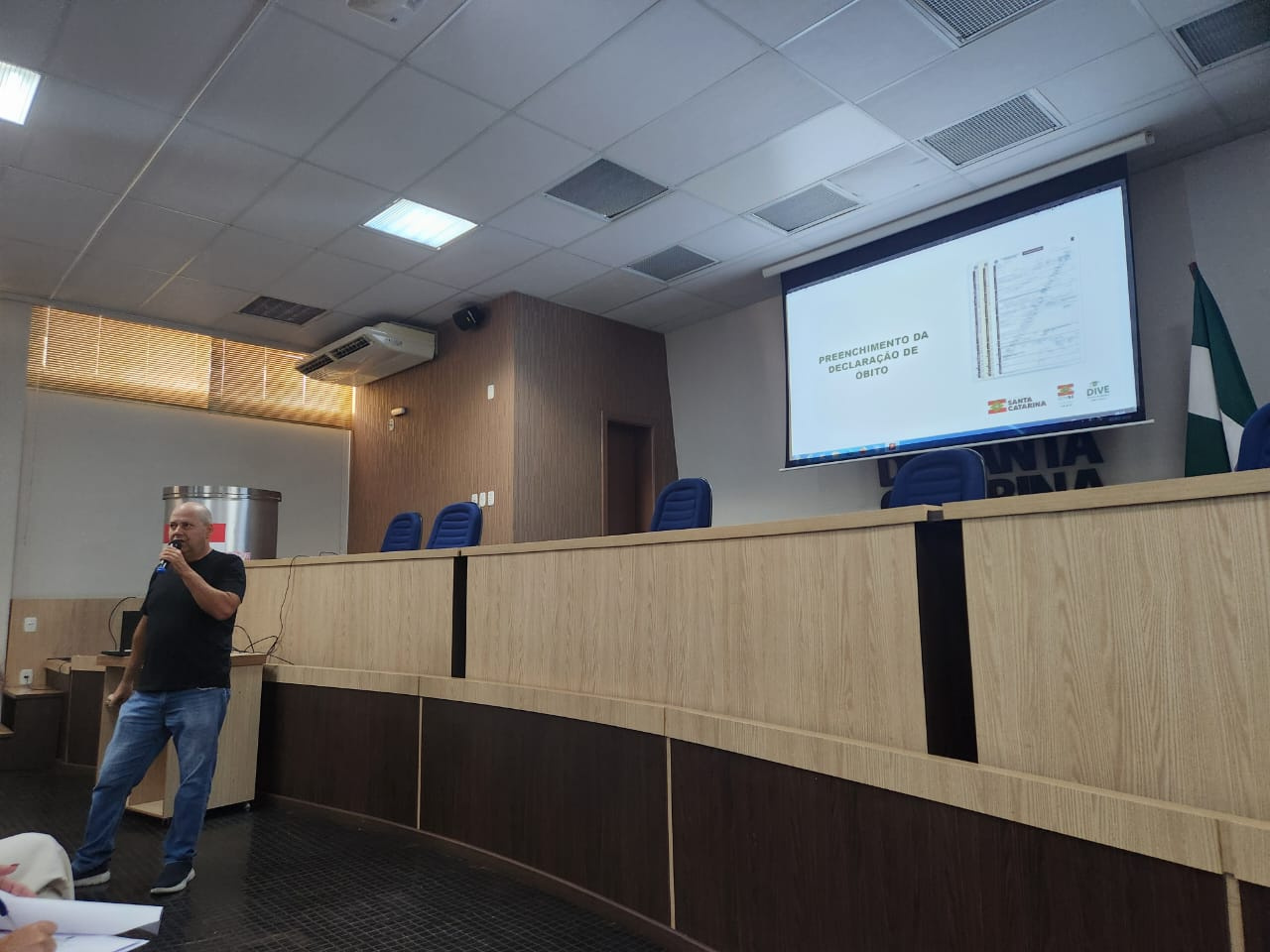 Profissionais médicos da rede de atenção pública / privada / hospitalar/ IML e técnicos do SIM - Sistema de Informação sobre Mortalidade participaram na sexta-feira (02) de uma capacitação sobre a importância do correto preenchimento da Declaração de Óbito. A capacitação aconteceu no auditório da Regional de Saúde de Chapecó e o palestrante foi Dr. Yuri Munir Igor Alves Guimarães Figueiredo, médico pediatra, codificador Estadual de causa básica de óbito e interlocutor do SIM do Estado da Saúde de Santa Catarina. Ela foi promovida pela Gerência Regional de Saúde de Chapecó em parceria com a Diretoria de Vigilância Epidemiológica do Estado da Saúde de Santa Catarina e com a Secretaria Municipal de Saúde de Chapecó.
