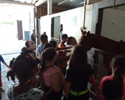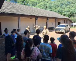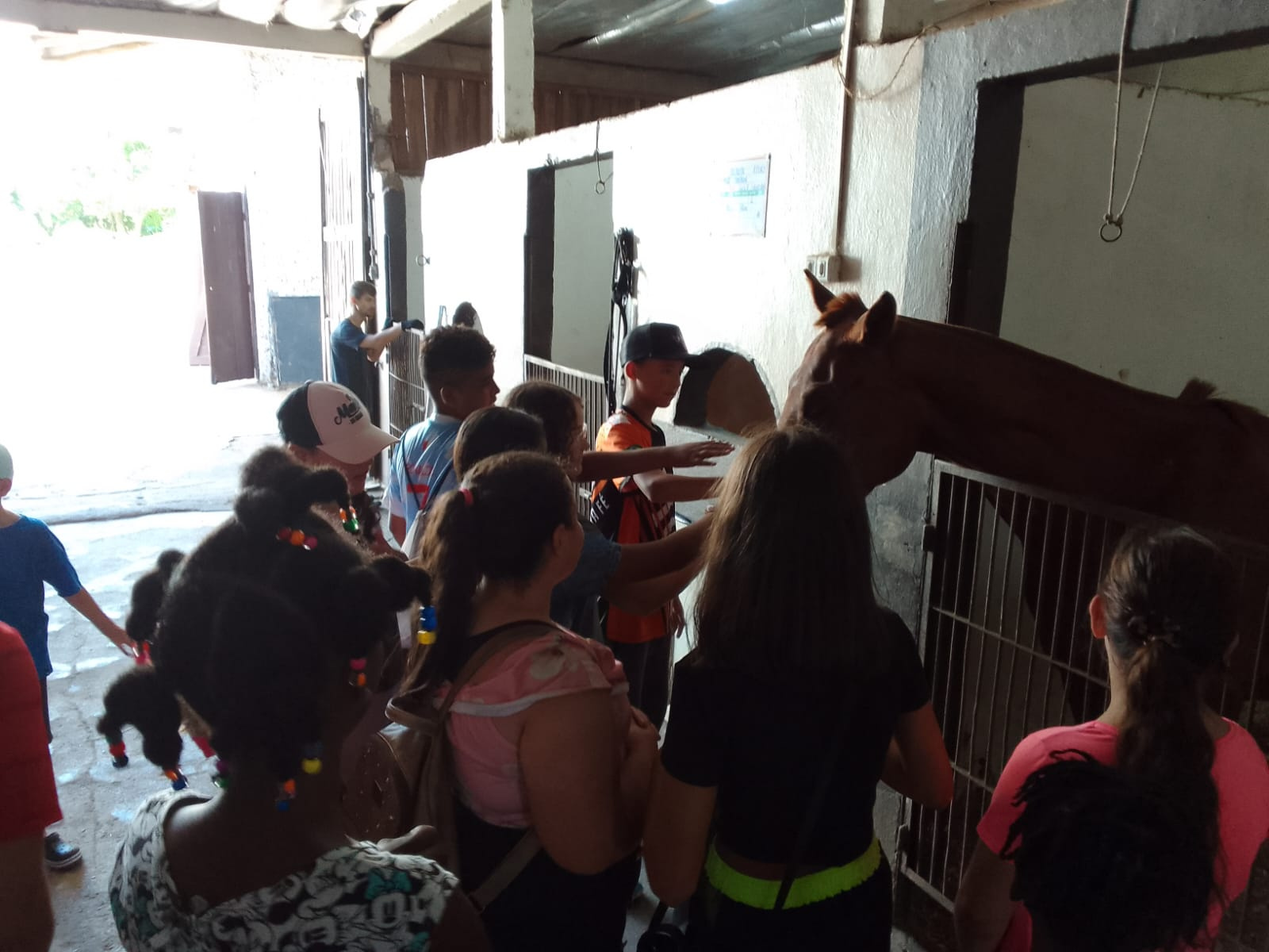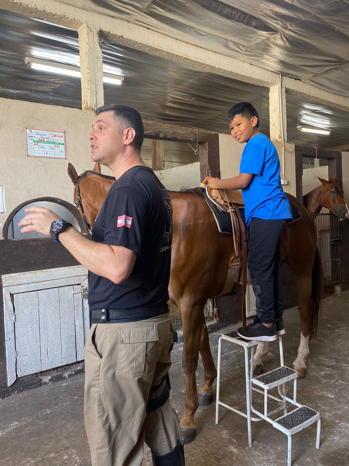 A Policial Deise recebeu o grupo e apresentou os serviços que o Batalhão realiza. Na oportunidade a equipe do Tático sanou as dúvidas do grupo sobre o trabalho que desenvolvem. Ao visitar a Cavalaria o grupo pode conhecer os objetivos do trabalho com os cavalos, também. A maioria das crianças e adolescentes puderam experimentar uma volta com o cavalo no estábulo do local. As crianças e os adolescentes gostaram muito do passeio, pois puderam conhecer com detalhes o trabalho no Batalhão, sendo que a maioria não conhecia o local.