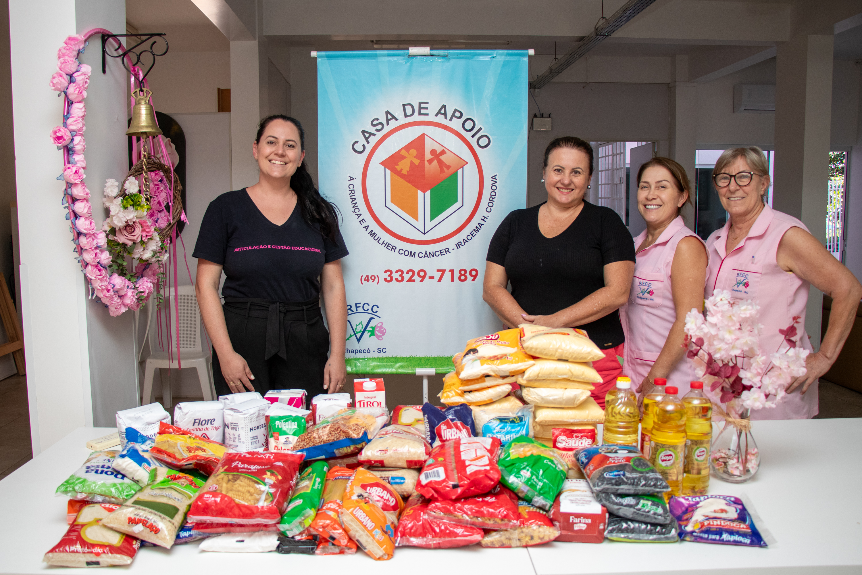 Astrit Tozzo, Secretária de Educação, elogiou a proposta. Nesta ação, decidimos realizar a doação dos alimentos arrecadados para a Rede Feminina de Combate ao Câncer de Chapecó, que é uma instituição que contribui para promover a saúde, cuidado e o bem-estar das mulheres de nossa cidade e região, comentou. A entrega dos itens foi realizada na tarde de ontem, dia 11, e serão usados para as refeições das mulheres que ficam na casa de acolhida, enquanto estão em tratamento contra a doença.