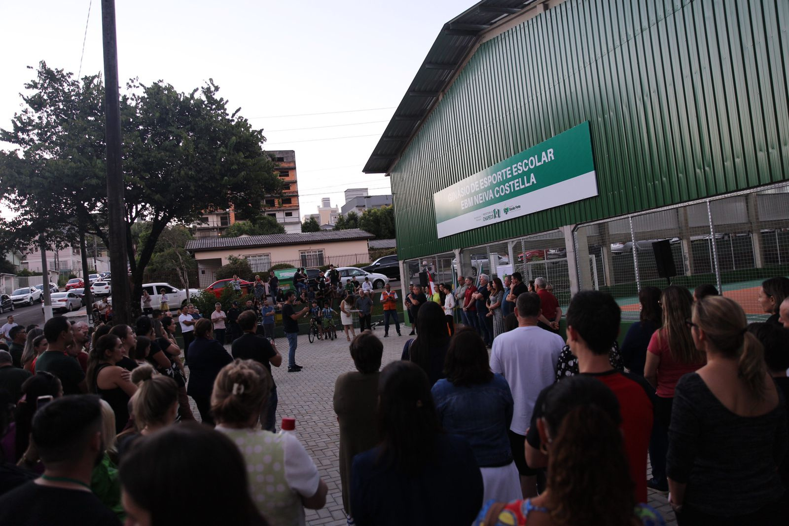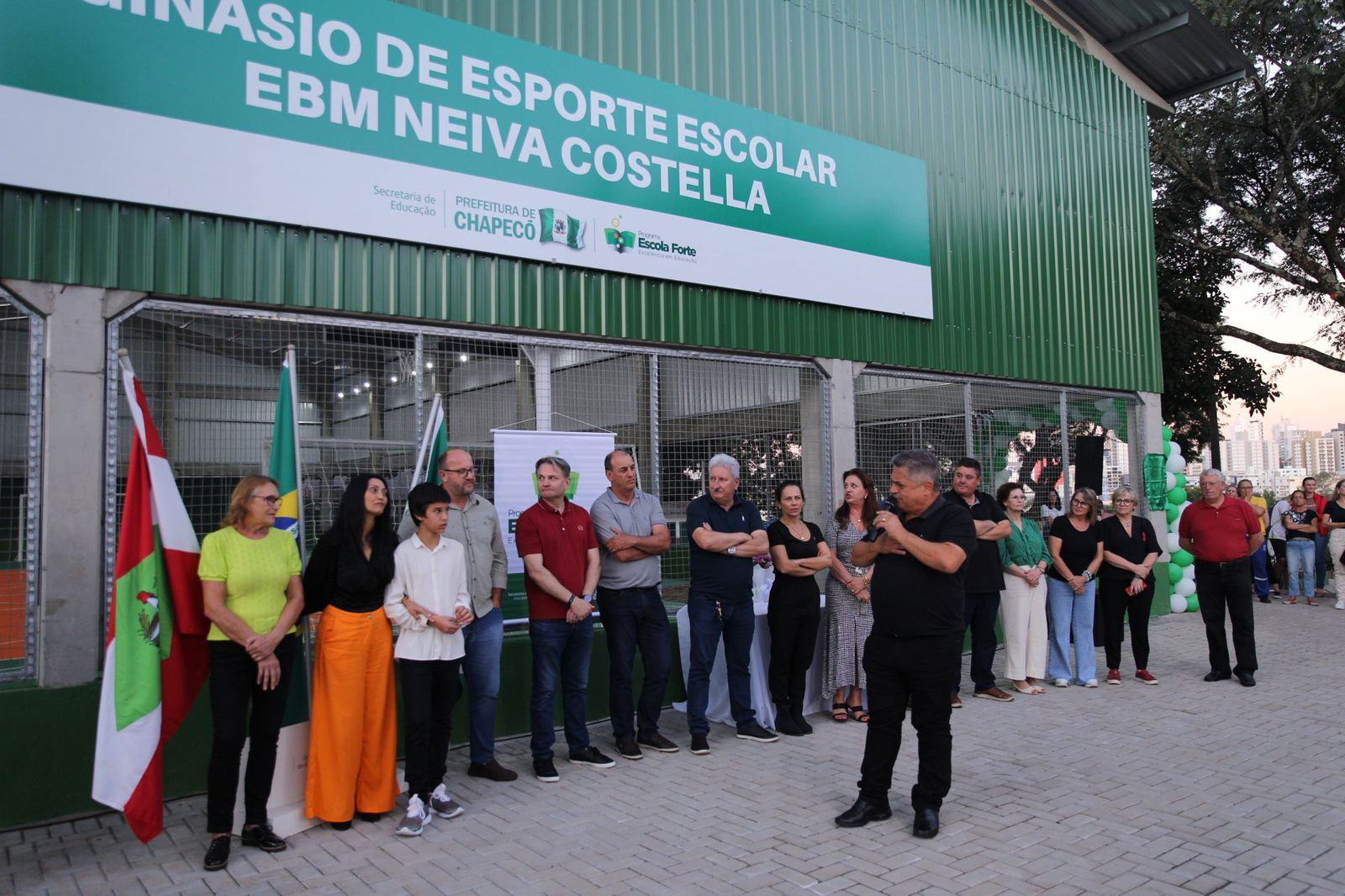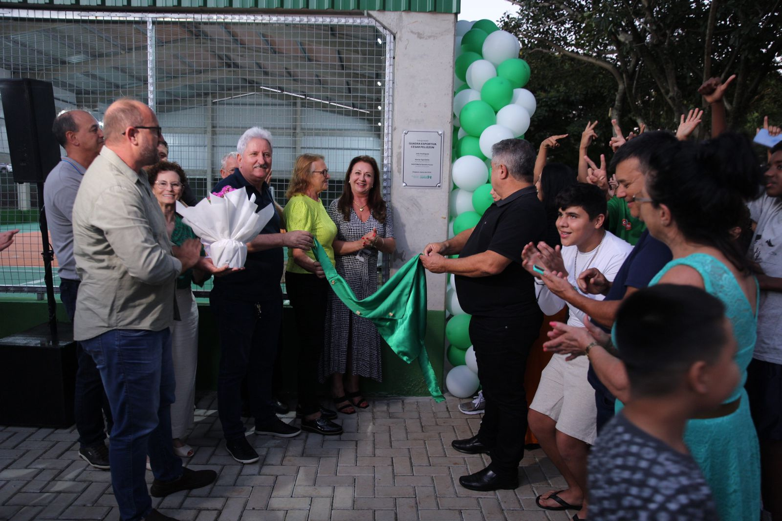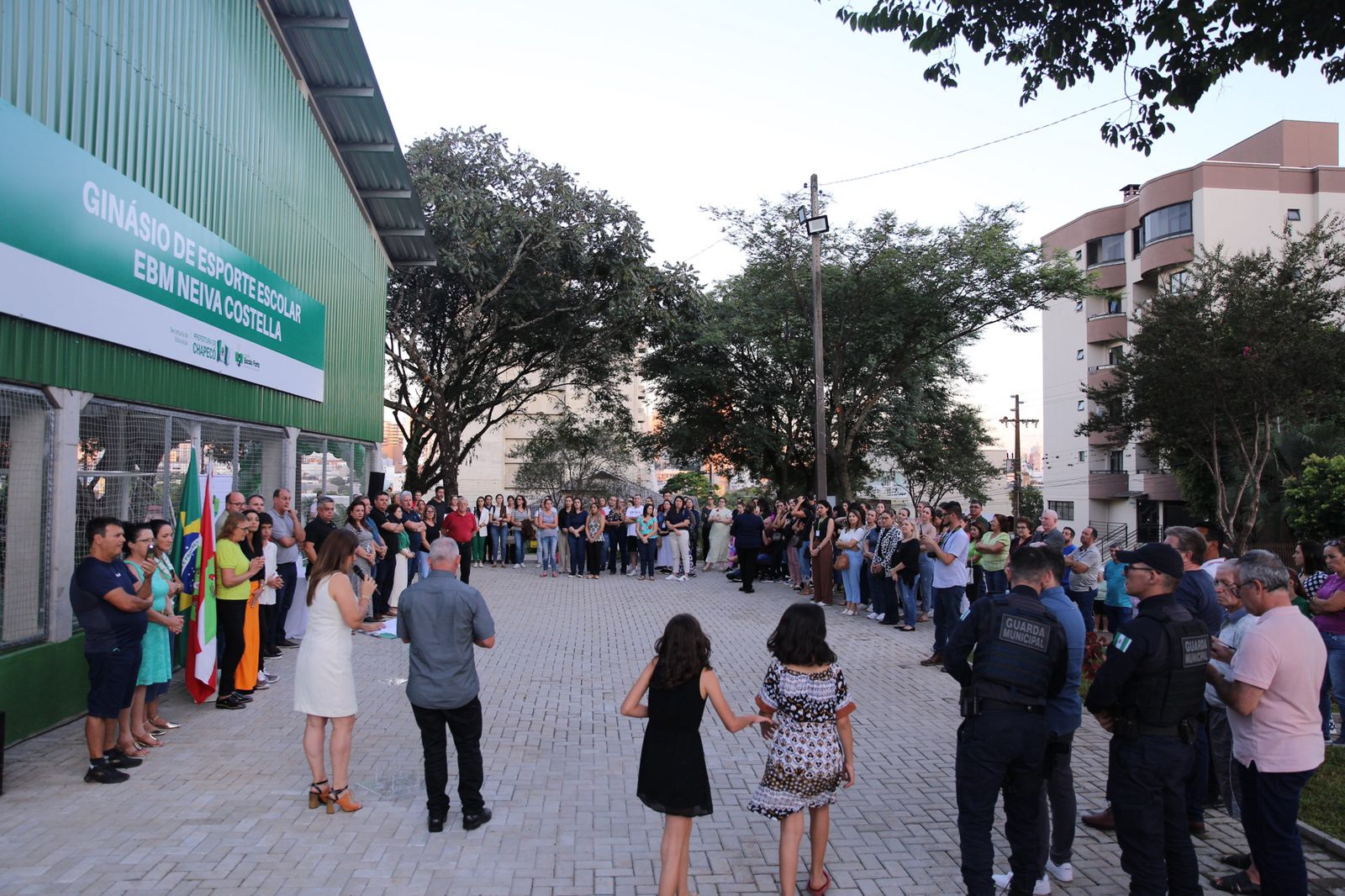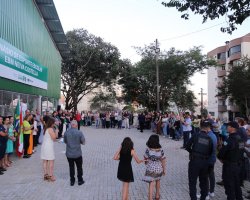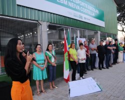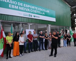 Foi inaugurado no início da noite desta segunda-feira o ginásio da EBM Neiva Costella, no bairro São Cristóvão, num investimento de quase R$ 700 mil da Prefeitura. No ato foi descerrada a placa que homenageia o ex-servidor público municipal César Pelizzon, com o nome da quadra esportiva.