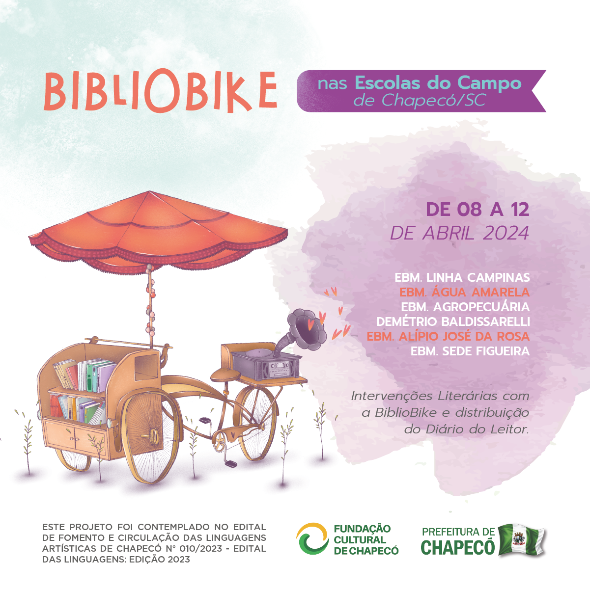 As apresentações também serão seguidas de bate-papo sobre o processo de concepção do projeto, escolha do acervo e como a equipe trabalha por meio das políticas públicas da cultura para levar as intervenções para diversos lugares. O projeto "BiblioBike nas Escolas do Campo de Chapecó foi contemplado pelo Edital de Chamamento Público nº 010/2023 - Edital de Fomento e Circulação das Linguagens Artísticas de Chapecó: Edição 2023.