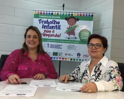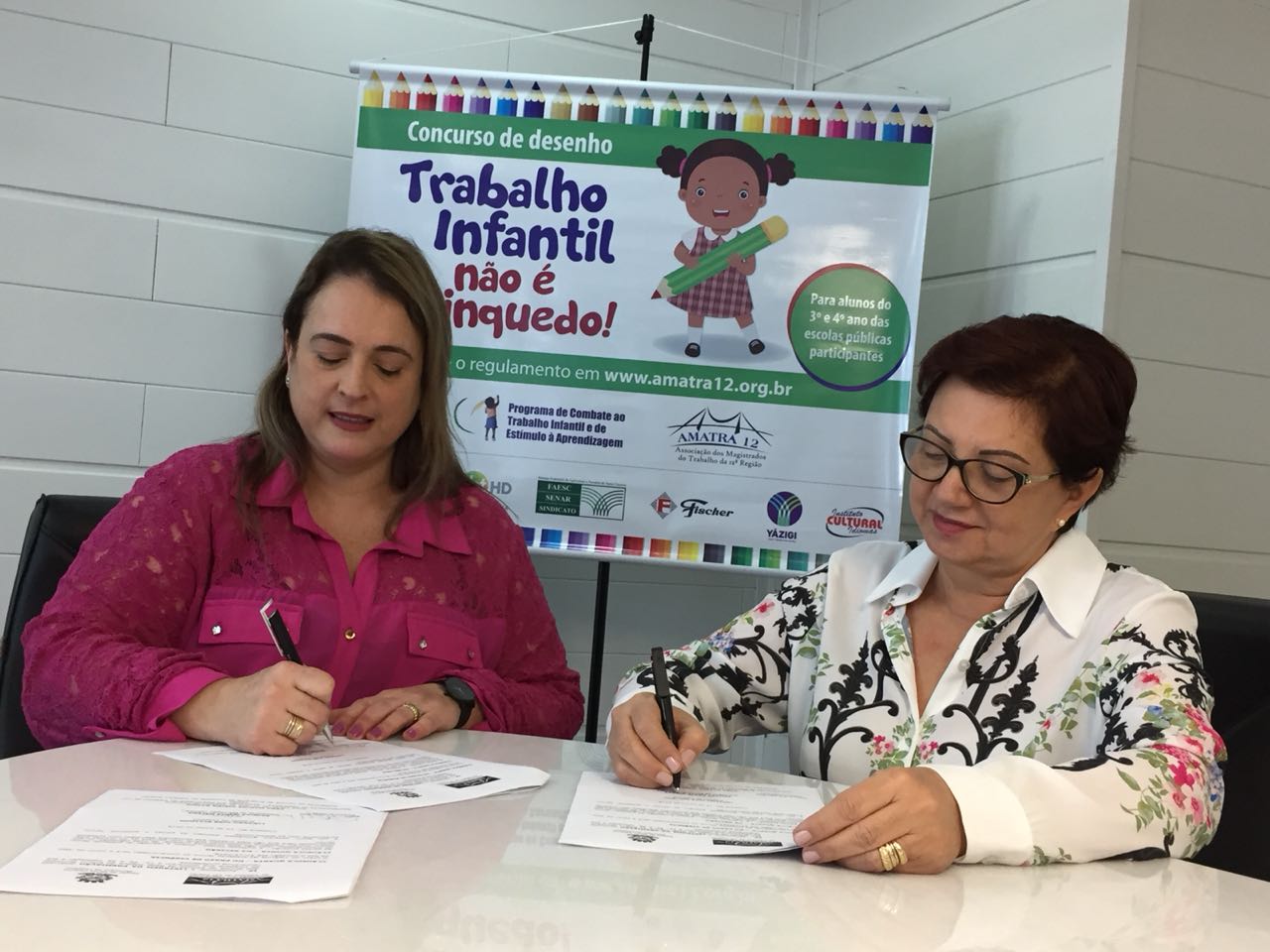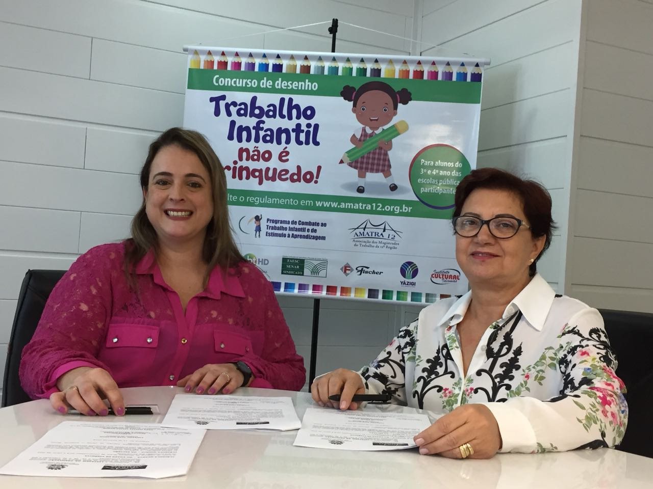 A Secretária da Educação de Chapecó, Sandra Maria Galera, representou o prefeito Luciano Buligon na assinatura do termo de adesão ao concurso de desenho promovido pela Associação dos Magistrados da Justiça do Trabalho, da 12a. Região - Amatra 12, em parceria com o Programa de Combate ao Trabalho e Estímulo à Aprendizagem. A assinatura do termo com a presidente da Amatra, juíza Andréa Haus Bunn, aconteceu na quarta-feira (13), na sede da entidade, em Florianópolis. O concurso é destinado a alunos dos terceiros e quartos anos das escolas da rede pública de ensino nos municípios de: Araquari, Blumenau, Brusque, Chapecó, Criciúma, Joinville, Lages, Rio do Sul, São José, São Miguel do Oeste, Videira e Xanxerê.