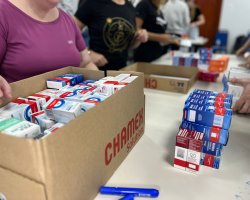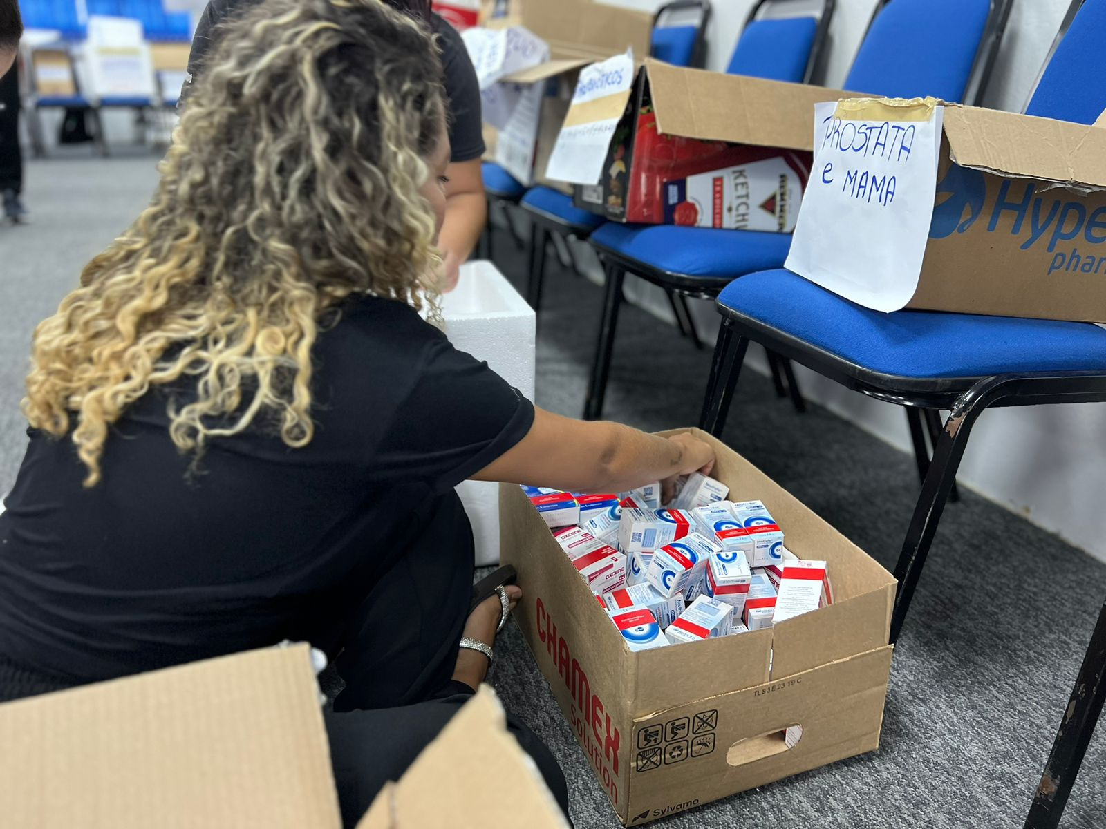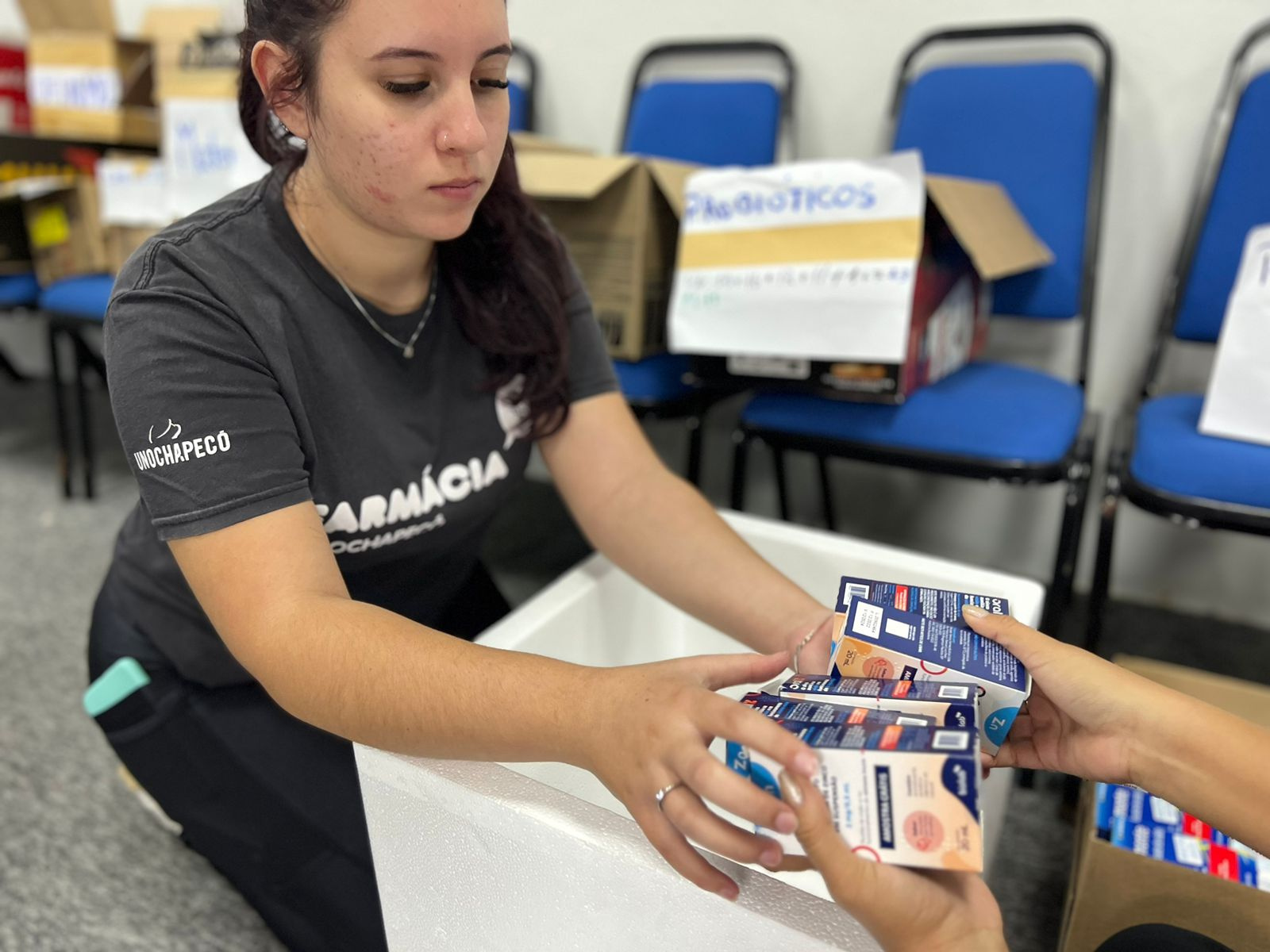 Além de alimentos e água, a solidariedade também se estende aos itens essenciais de higiene e saúde. Thaise Nunes, aluna de Farmácia da Unochapecó, descreveu o processo de organização dos medicamentos destinados às vítimas: "Estou aqui com algumas meninas também do curso, algumas pessoas que se prontificaram para a gente estar fazendo a organização da medicação que está indo para o Rio Grande do Sul. A gente inicia, então, fazendo uma contagem geral de todos os medicamentos que vêm sendo doados e a gente faz uma separação da validade, que são mais válidos para os meses a partir de mês de outubro, a gente coloca nas caixas que vão ser enviadas e umas com uma densidade mais próxima a gente deixa numa caixa separada também."