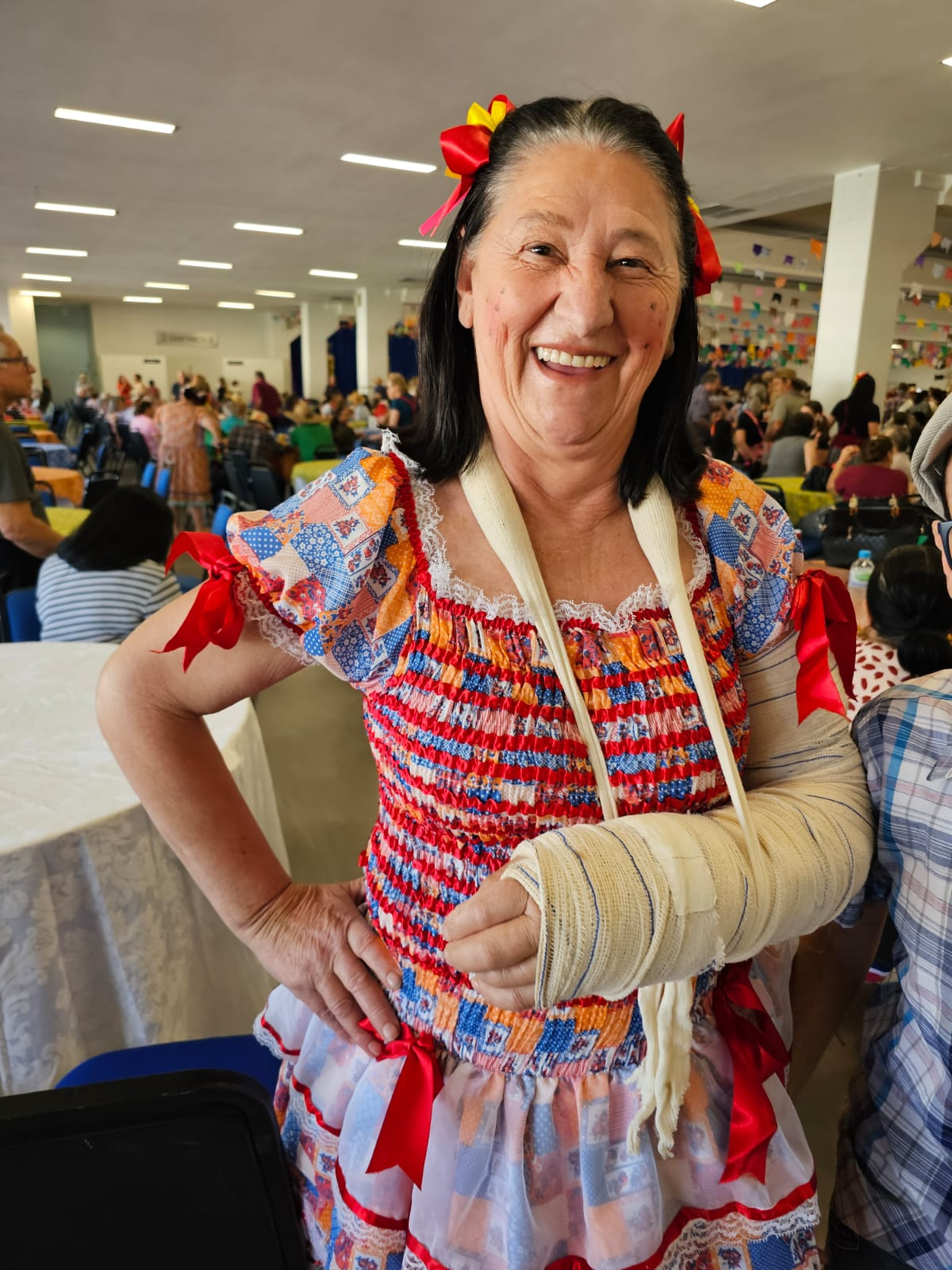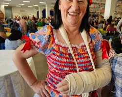 Nem mesmo o braço quebrado impediu a Luiza Barp do bairro SAIC de curtir a festa com o grupo de idosos do bairro. Ela disse que sempre participa das festas e movimenta os integrantes do grupo para participar. Esse ano com todo cuidado por causa do braço, mas mesmo assim vim participar e incentivei para que todo grupo viesse também para se divertir, comentou.