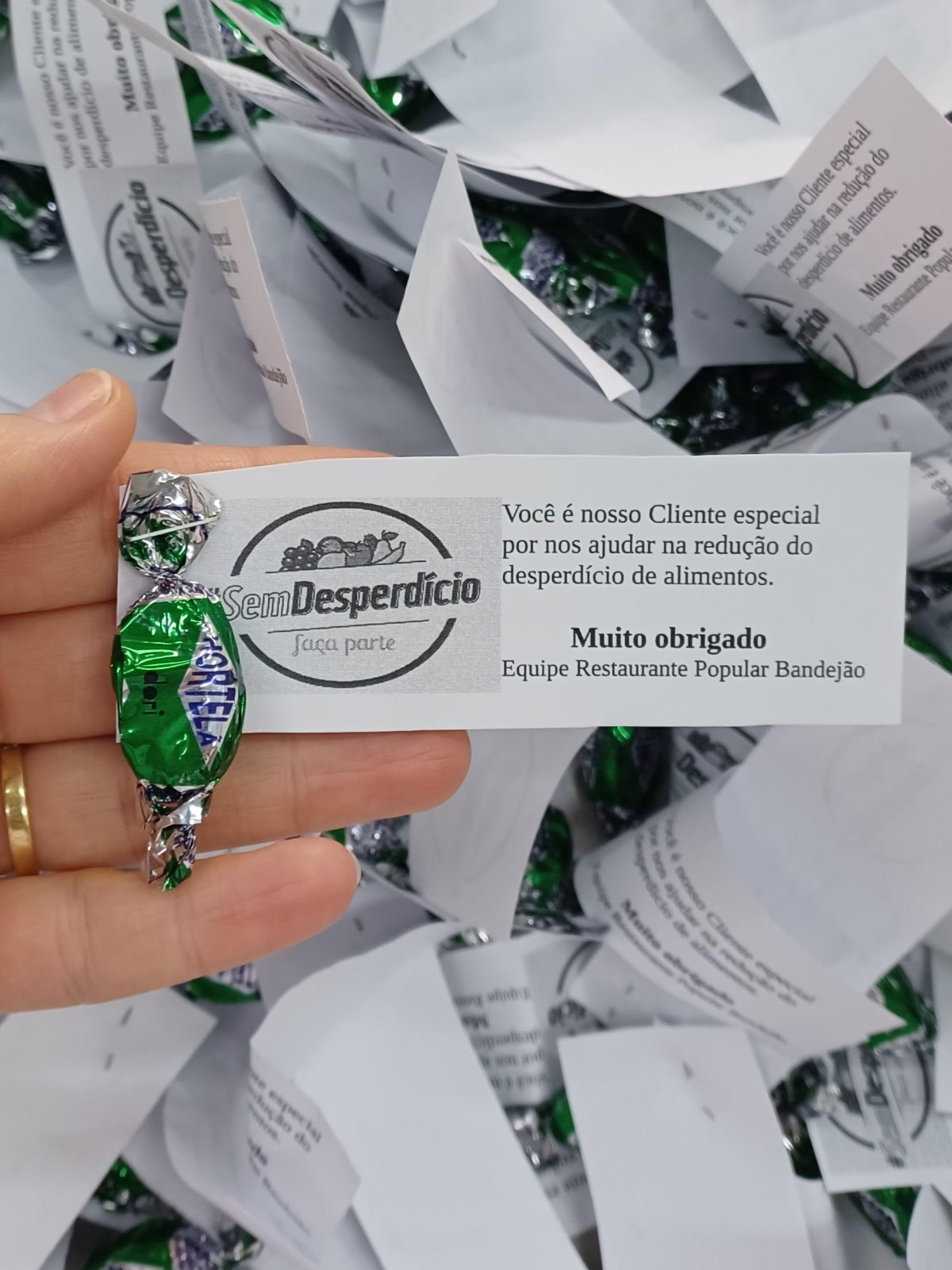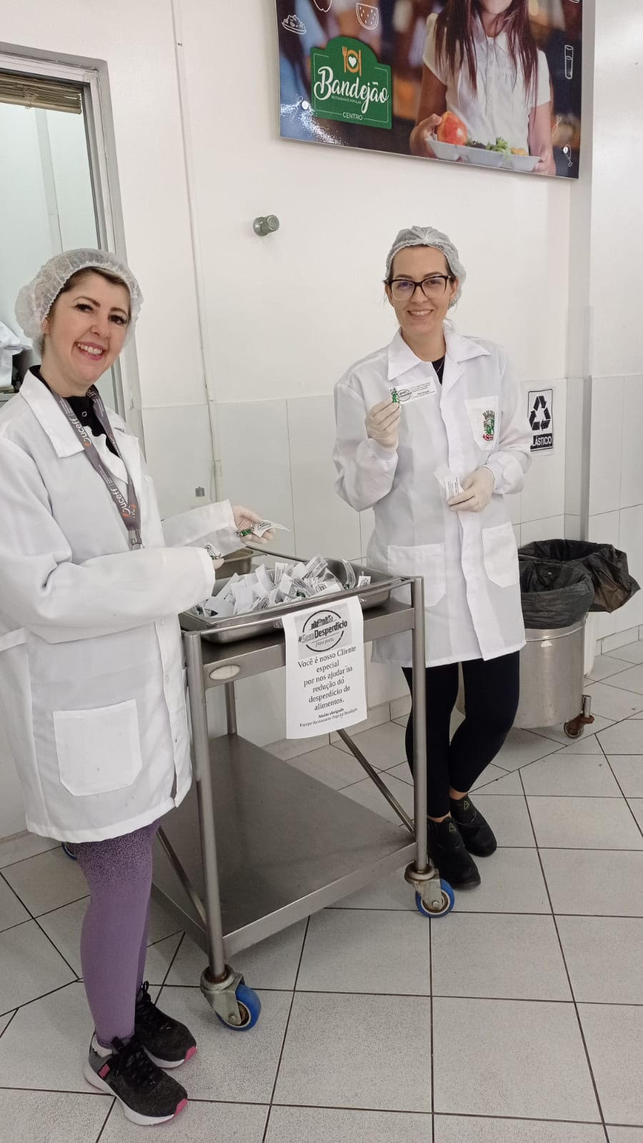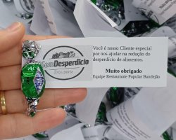 Ela disse que a ação realizada junto aos clientes teve como objetivo a conscientização para a redução do desperdício de alimentos. A ação foi desenvolvida pela equipe com apoio da estagiária de Nutrição da Uceff Cristiane Pivoras e consistiu em uma abordagem direta com o cliente após o consumo da refeição. Após o término da refeição, foi verificada a bandeja do cliente durante o ato de devolução. Não havendo o desperdício de alimentos o cliente era parabenizado com um cartão e uma bala. Esse simples cartão simbolizava nosso agradecimento por colaborar com o não desperdício de alimentos, explicou. Aqueles que não recebiam o cartão, eram orientados sobre as maneiras para evitar o desperdício.