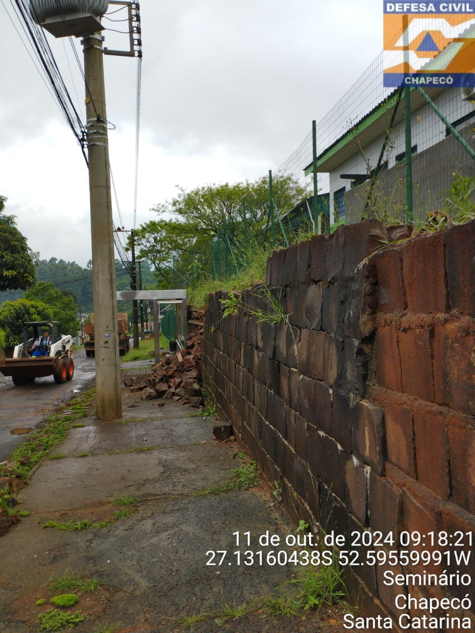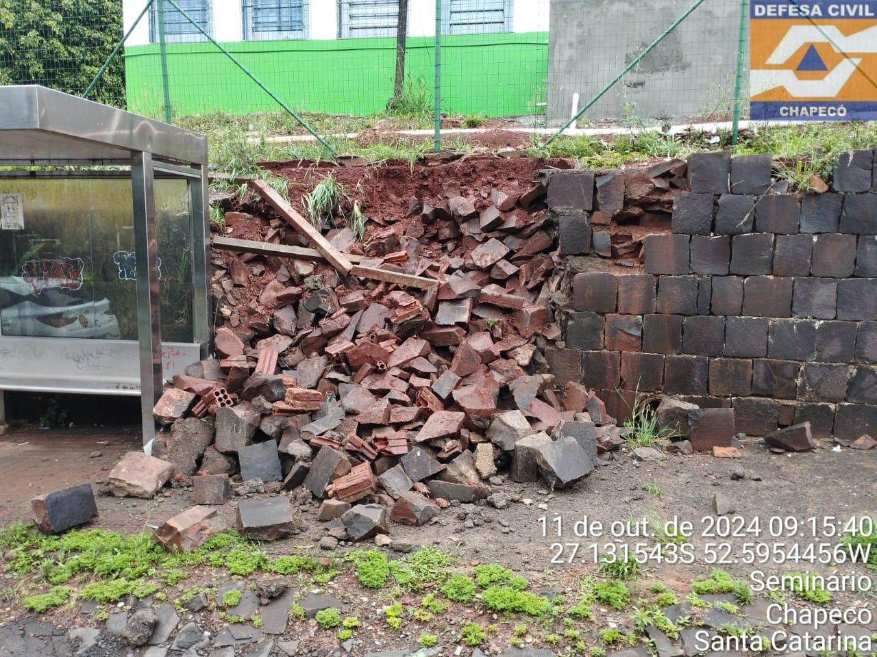 A Defesa Civil de Chapecó registrou uma queda de muro causada pelo grande volume de chuva ocorrido de quinta-feira para sexta-feira. De acordo com o coordenador municipal do órgão, Luís Lara, foi na Escola Básica Municipal Realeza, na rua Aquiles Girardi, no bairro Seminário.