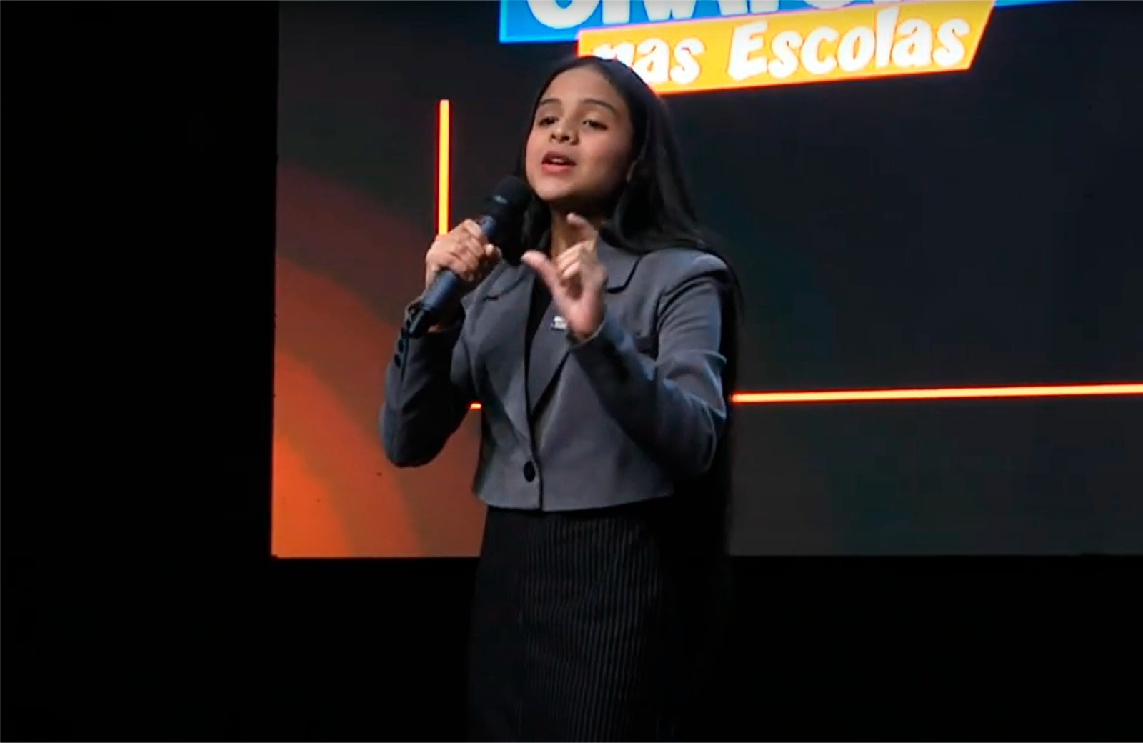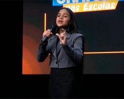 A estudante da EBM Sereno Soprana, Michelle Sofia Custódio Leal, é a campeã da etapa nacional do Concurso Oratória nas Escolas 2024. Ela competiu na categoria com estudantes do 8º e 9º ano.