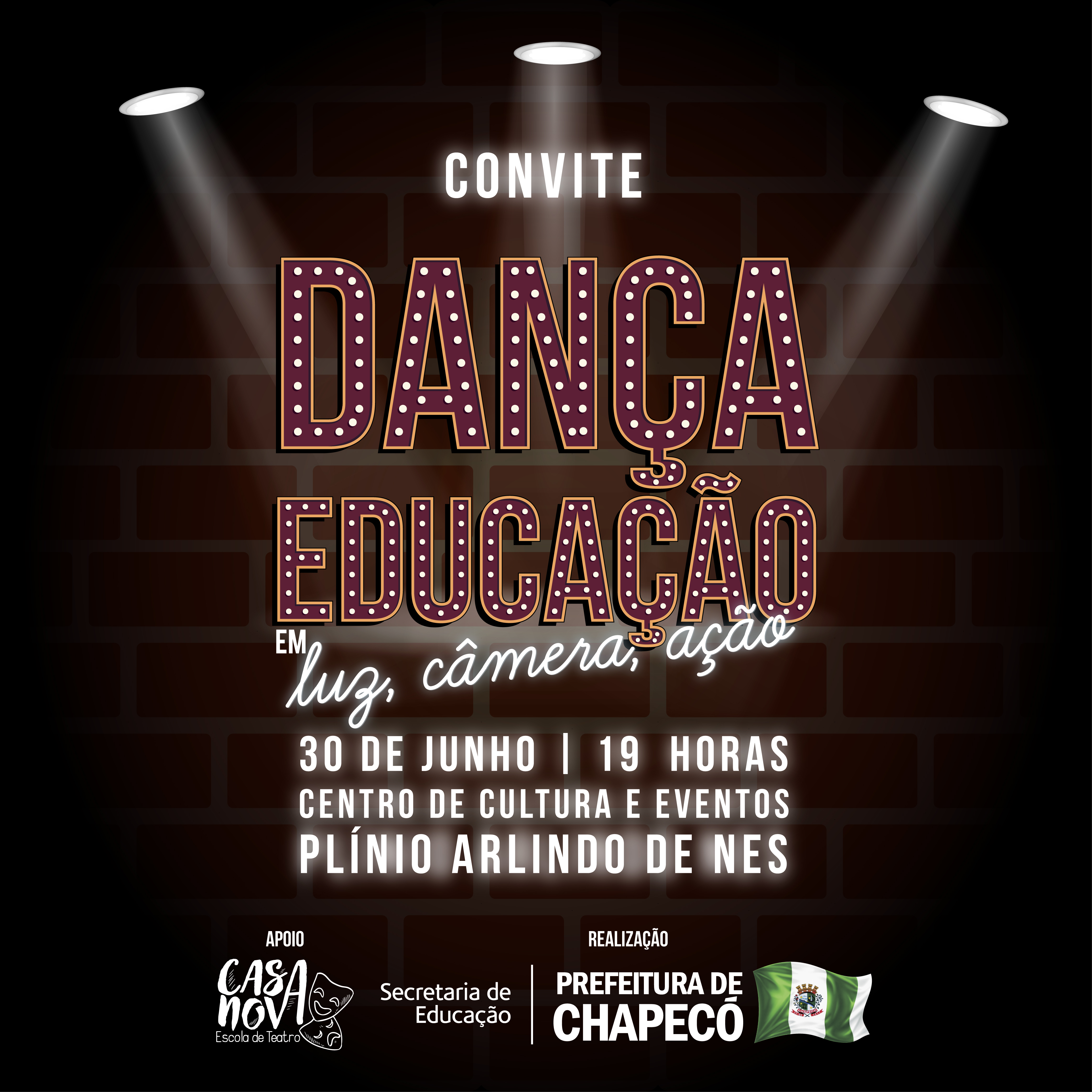 No sábado (30), acontece no Teatro do Centro de Cultura e Eventos Plínio Arlindo De Nes o Espetáculo Dança Educação em Luz, Câmera, Ação, promovido pela Administração Municipal, por meio da Secretaria de Educação. O evento acontecerá as 19 horas, é aberto à comunidade e contará com a participação das famílias, alunos, professores para um momento cultural.