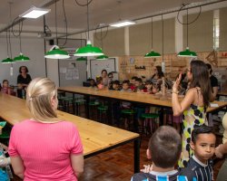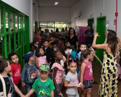 Na sexta-feira (01), a EPC Cyro Sosnosky promoveu uma visita guiada pelos espaços da instituição para a turma da Pré-Escola do CEIM Criança Feliz, acompanhada de seus familiares e professores, e para a turma de 1º ano do Cyrinho.